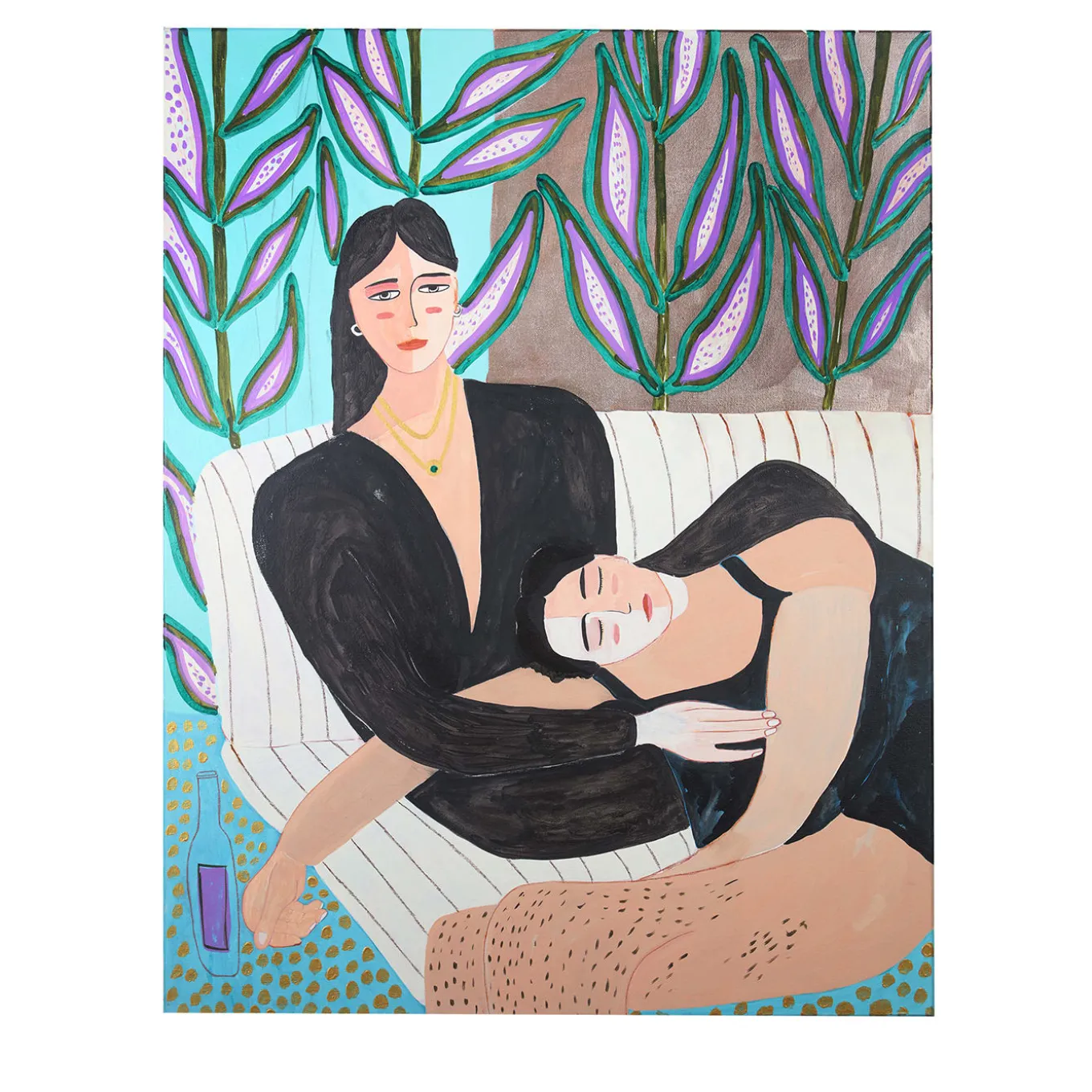 Le pennellate piatte e le tonalità acide di questo dipinto a tecnica mista su tela raffigurano una scena in cui un uomo dorme rilassato in grembo a una donna, il cui sguardo è allo stesso tempo calmo e preoccupato. Piante e fiori stilizzati sullo sfondo simboleggiano dinamismo e vitalità, controbilanciati dalla posa immobile della donna in abito nero che trasmette un senso di seduzione e forza.