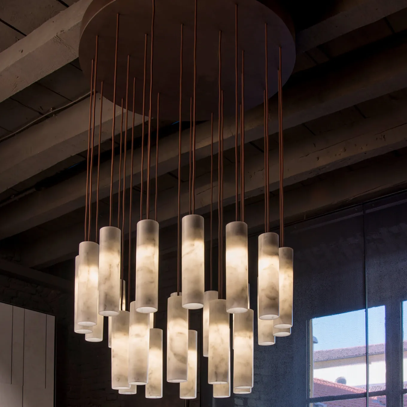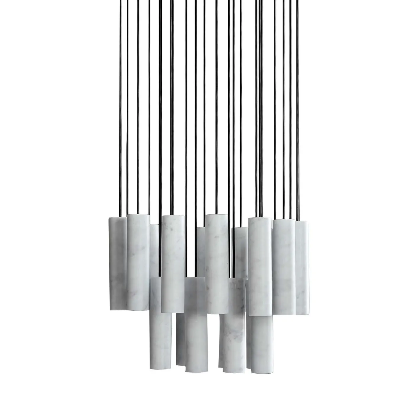 La straordinaria bellezza del design della plafoniera Silo Chandelier è dovuta all’utilizzo di pietra e marmo per la realizzazione dei cilindri luminosi. Per creare una luce incantevole e seducente, gli apparecchi sono disponibili nel classico marmo Bianco Carrara o nei toni caldi della Pietra D’Avola. Disponibile anche come lampada singola o a grappolo.