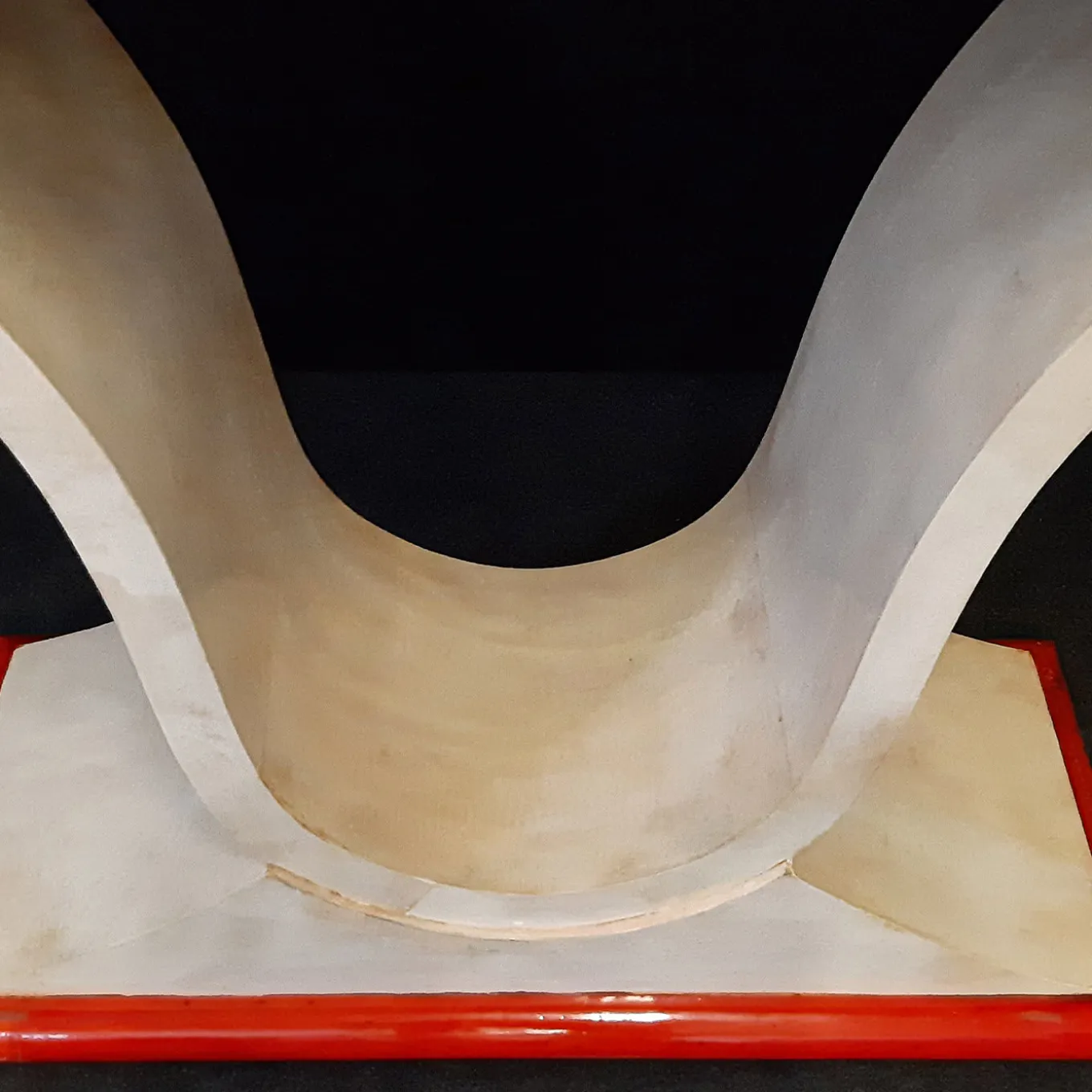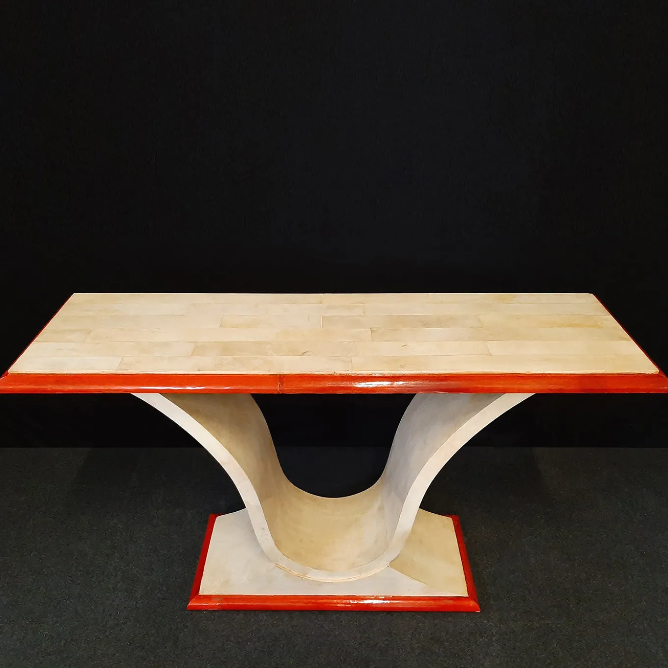 Questa consolle di ispirazione Art Déco abbina il gusto per le tecniche tradizionali pregiate a un vibrante tocco cromatico, con la pergamena rossa che ricopre il piano e le cornici della base. La pergamena naturale di prima qualità, in una versatile tonalità di avorio, avvolge in uno stretto abbraccio il resto della sua maestosa silhouette, il cui elemento strutturale sinuoso a forma di V conferisce all’insieme un elegante accento scultoreo.