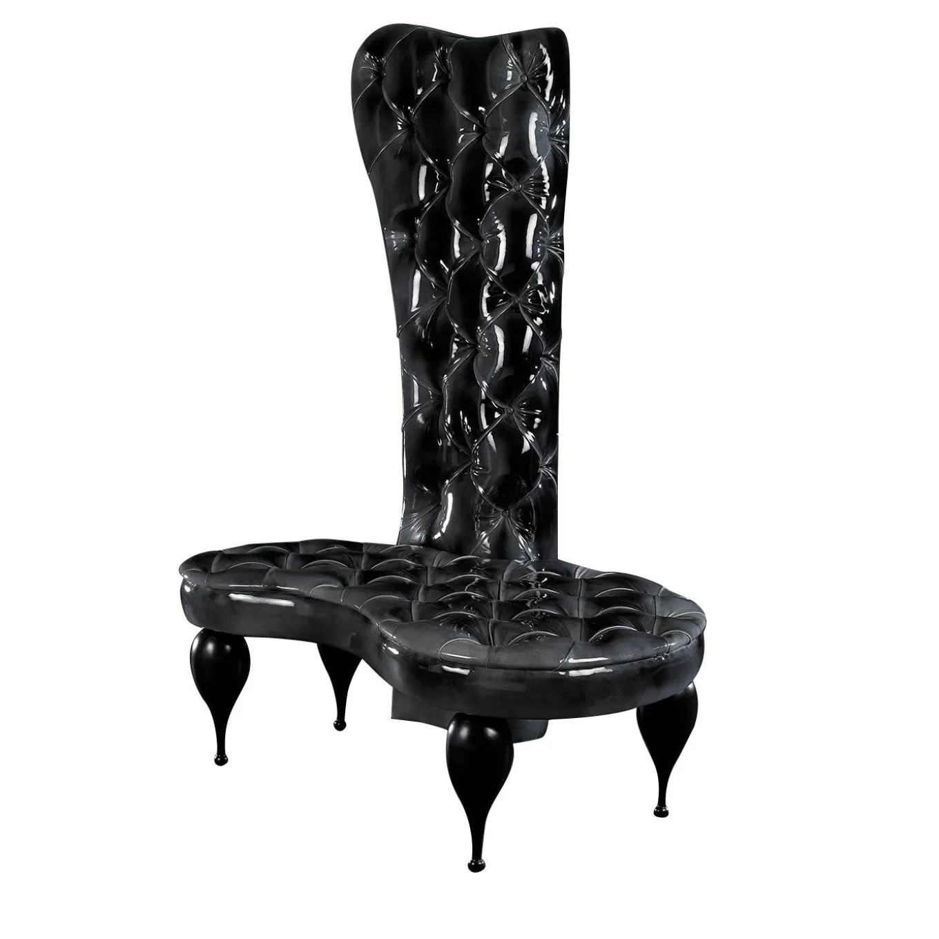 La silhouette sinuosa di questo pezzo unico è esaltata dal sensuale rivestimento in ecopelle nera lucida, che crea un effetto visivo straordinario. Interamente realizzati a mano in compensato, sia la seduta che lo schienale sono dotati di cuscini in poliuretano espanso in stile capitonne che aggiungono un tocco vintage al pezzo. I piedi a cono arrotondati e sovradimensionati, in vernice nera lucida, contribuiscono all’aspetto audace di questo pezzo straordinario.