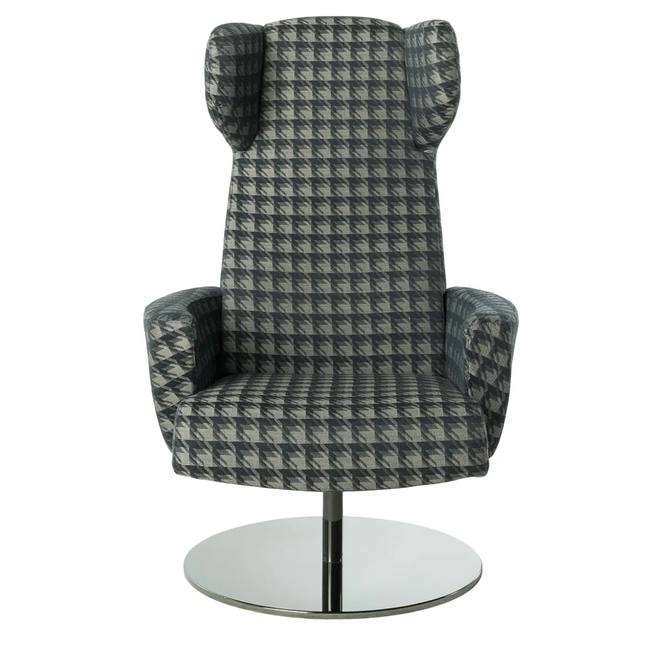 La poltrona “presidenziale” evoca uno stile senza tempo. La sua estetica vintage aggiornata offre un’eleganza accogliente, garantendo comfort e raffinatezza. Realizzata con una struttura in legno di pino e legno da ardere multistrato. Rivestita in tessuto Pied de Poule grigio, questa poltrona poggia su un’elegante base girevole in alluminio e ferro con finitura cromata nera. I cuscini decorativi sono esclusi.