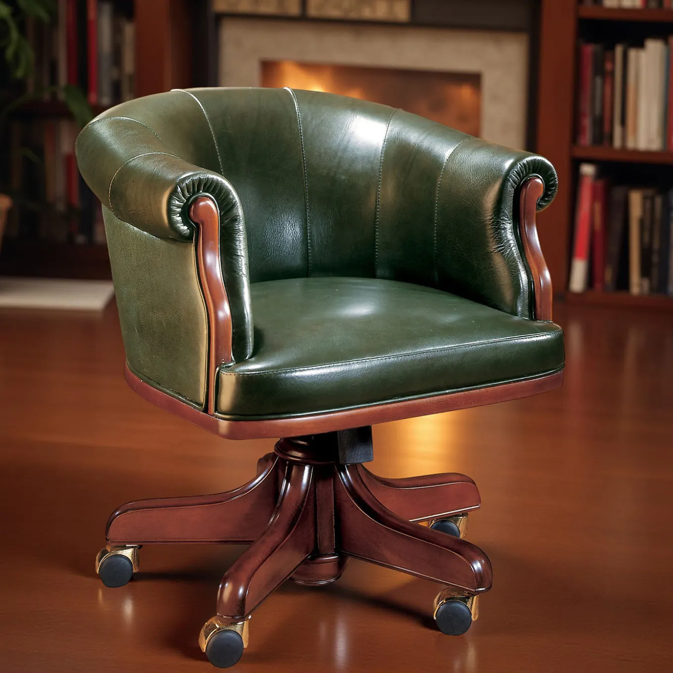 Poltrona girevole di lusso in stile classico con struttura in legno di faggio. L’altezza della seduta è regolabile e il meccanismo di oscillazione aiuta a mantenere una gamma completa di movimenti, bilanciando la postura. È imbottita con fettucce e schiuma di qualità superiore. Il rivestimento esalta particolarmente il lusso di questo modello e sottolinea il design avvolgente: la pelle di toro conciata riflette un’eleganza riservata. Sono disponibili altri colori di pelle, contattando il nostro Concierge.