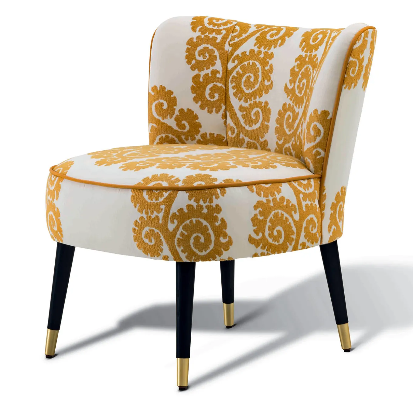 Questa sedia imbottita di classe e originale è caratterizzata da gambe in noce scuro con puntali in metallo verniciato ottone o bronzo. La seduta e lo schienale sono in legno e sono imbottiti con schiuma ad alta resistenza e densità variabile con inserto in poliuretano. Il rivestimento non può essere rimosso.