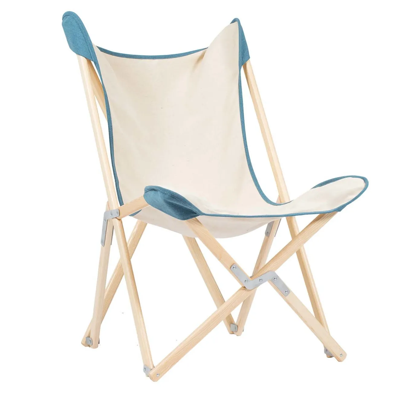 Questa splendida poltrona è un’interpretazione moderna dell’iconica sedia Tripolina utilizzata dalle truppe militari italiane in Libia. Grazie al suo meccanismo pieghevole, alla comoda seduta e alla sorprendente combinazione di colori, questo pezzo è un’aggiunta pratica ed elegante a un interno rustico-chic o contemporaneo. La struttura è realizzata a mano utilizzando il più pregiato frassino massiccio con una finitura naturale che completa splendidamente la seduta/schienale in tessuto color crema (50% cotone e 50% juta) con un orlo in blu-verde realizzato in tessuto 80% acrilico e 20% cotone.