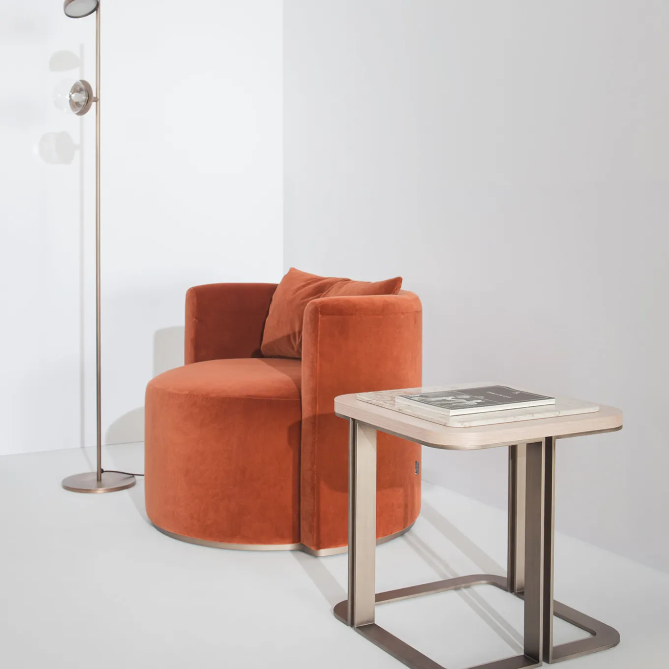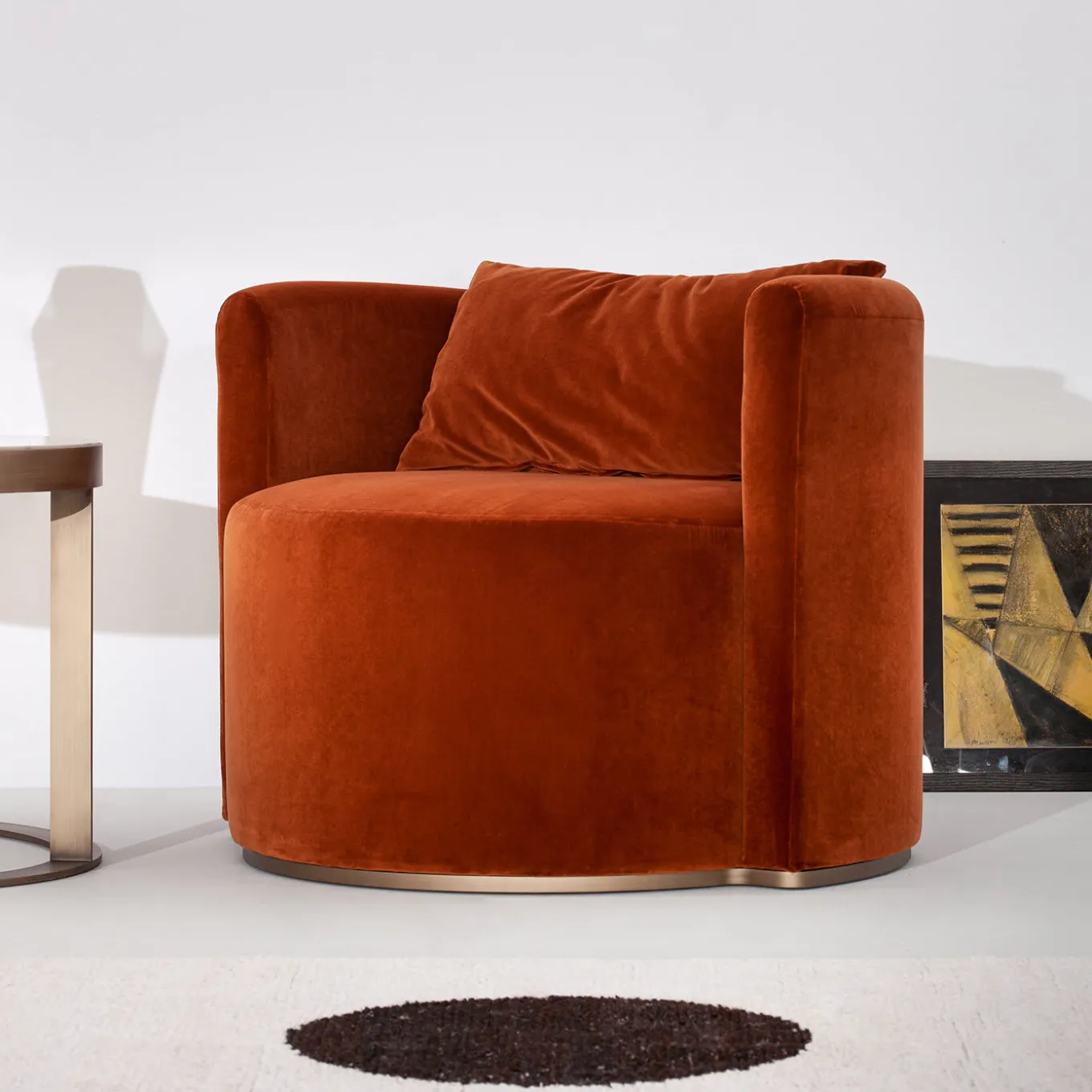Avvolta in un vibrante velluto rosso, la seduta arrotondata e l’avvolgente forma a botte di questa sofisticata poltrona creano un look dal fascino vintage in un salotto, un ingresso, una camera da letto o un’area lounge. L’invitante silhouette è realizzata in legno imbottito di poliuretano espanso con un esclusivo pannello posteriore curvo che abbraccia la seduta cilindrica (altezza 45 cm) appoggiata su una base a zoccolo in ottone spazzolato. Il cuscino in dotazione è imbottito di piume ed è sfoderabile in coordinato. Su richiesta, sono disponibili certificazioni per il settore contract e commerciale.