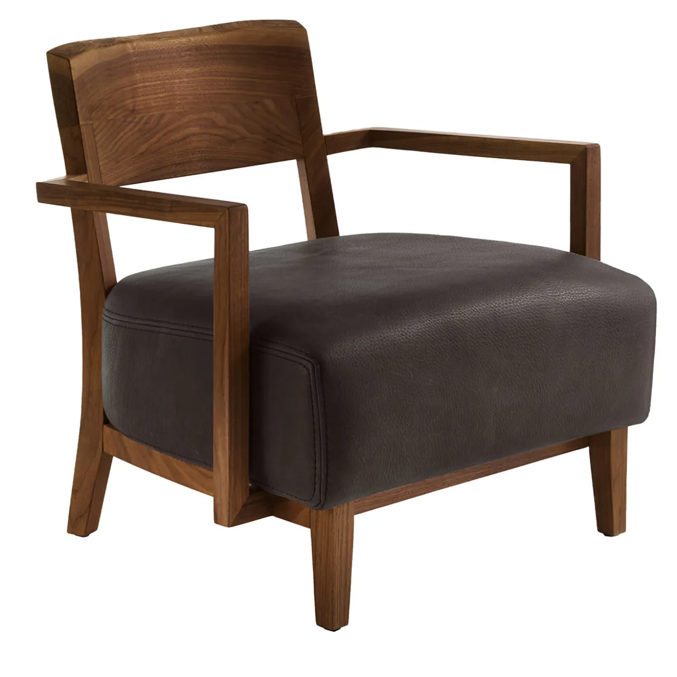 La seduta audace e il calore della struttura in noce senza nodi sono le caratteristiche di questa superba poltrona. La pregiata pelle nera riveste la seduta estremamente spessa e ampia, abbracciata da braccioli sottili e scolpiti che si uniscono a un robusto schienale aperto. Rifinita con una finitura a olio che conferisce una magnifica lucentezza.