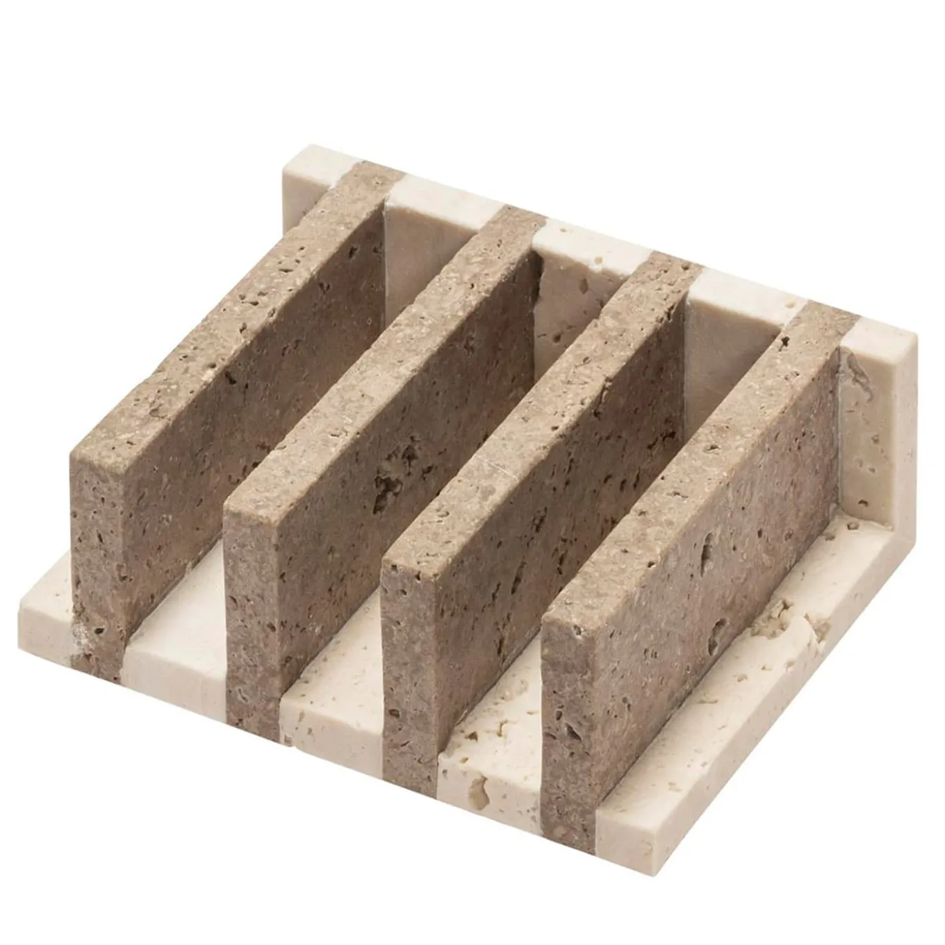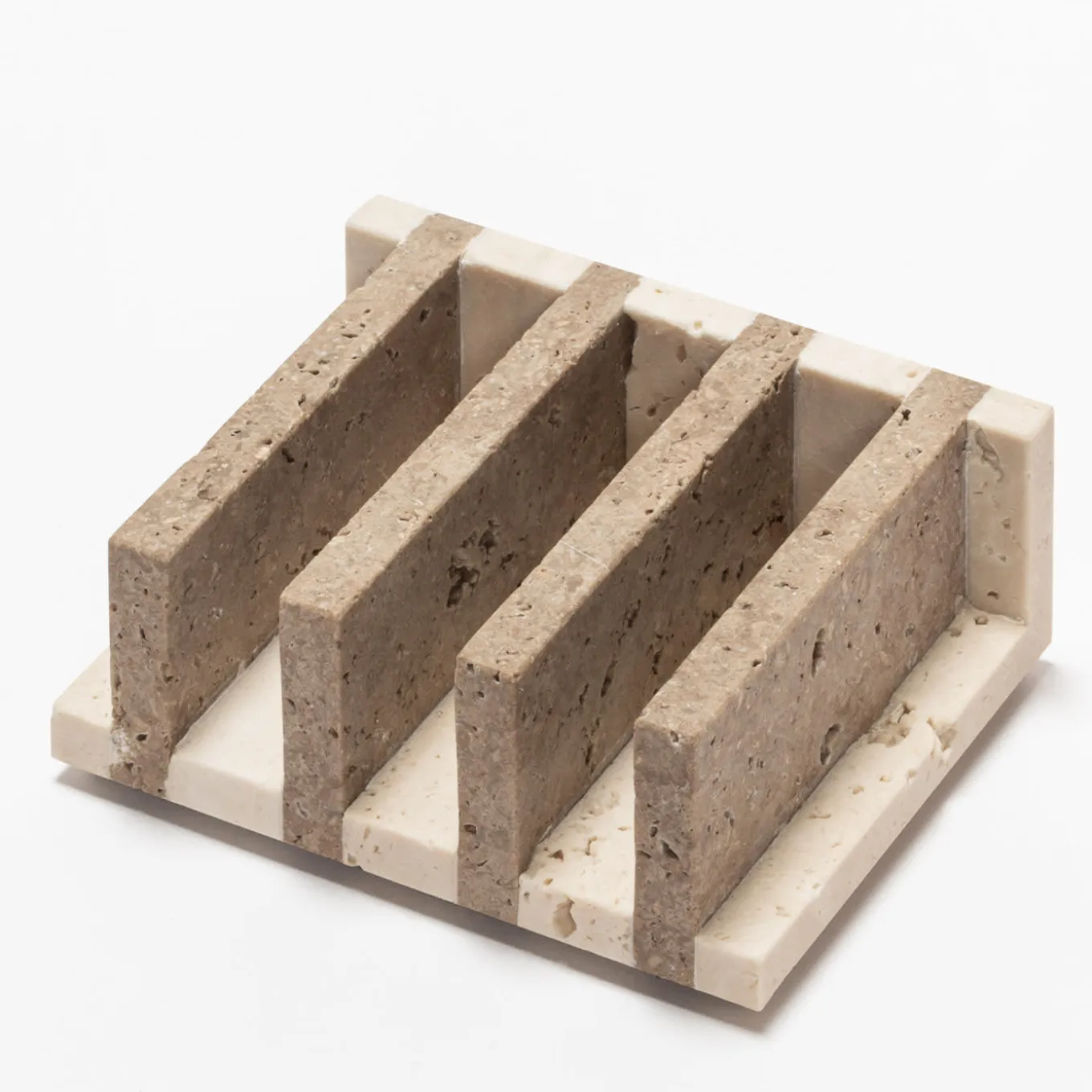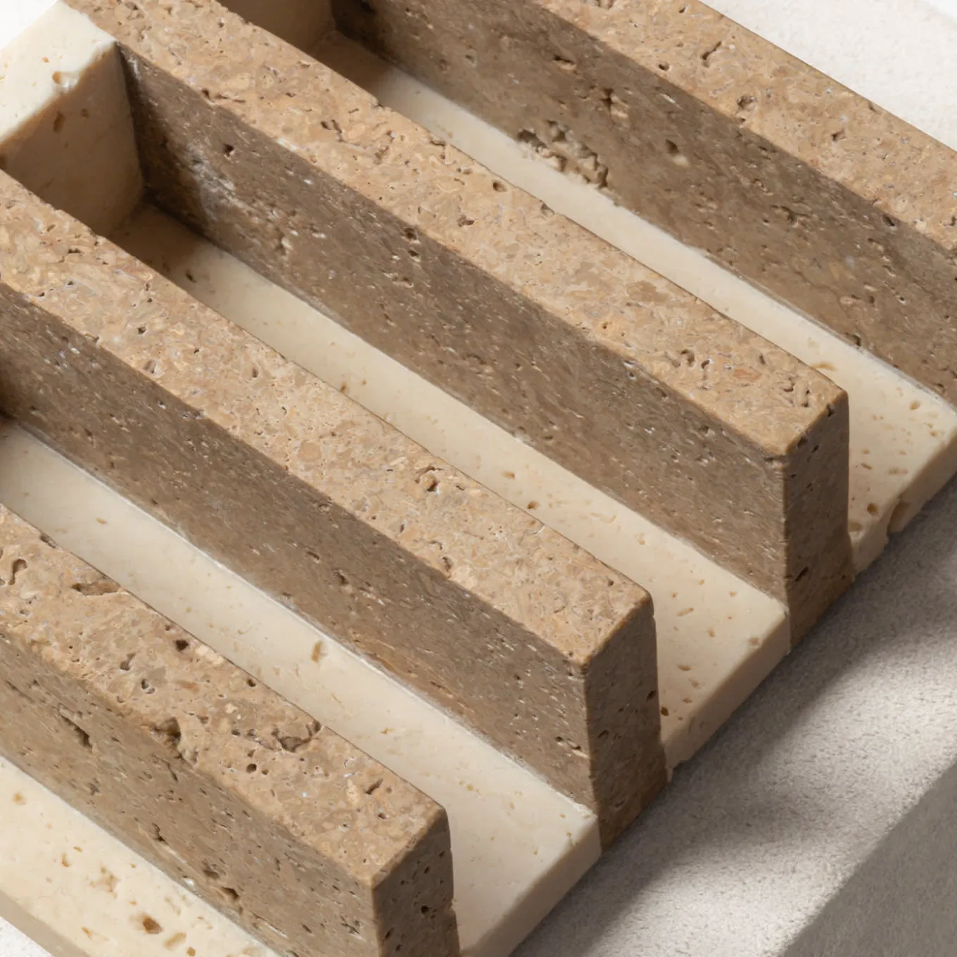 Con i suoi volumi monolitici e puramente geometrici, questa collezione per l’ufficio è caratterizzata da dettagli grafici nati dall’accostamento di due nuance di travertino, che creano un caratteristico contrasto visivo con l’aspetto materico e poroso di tale marmo. Design di Simone Fanciullacci.