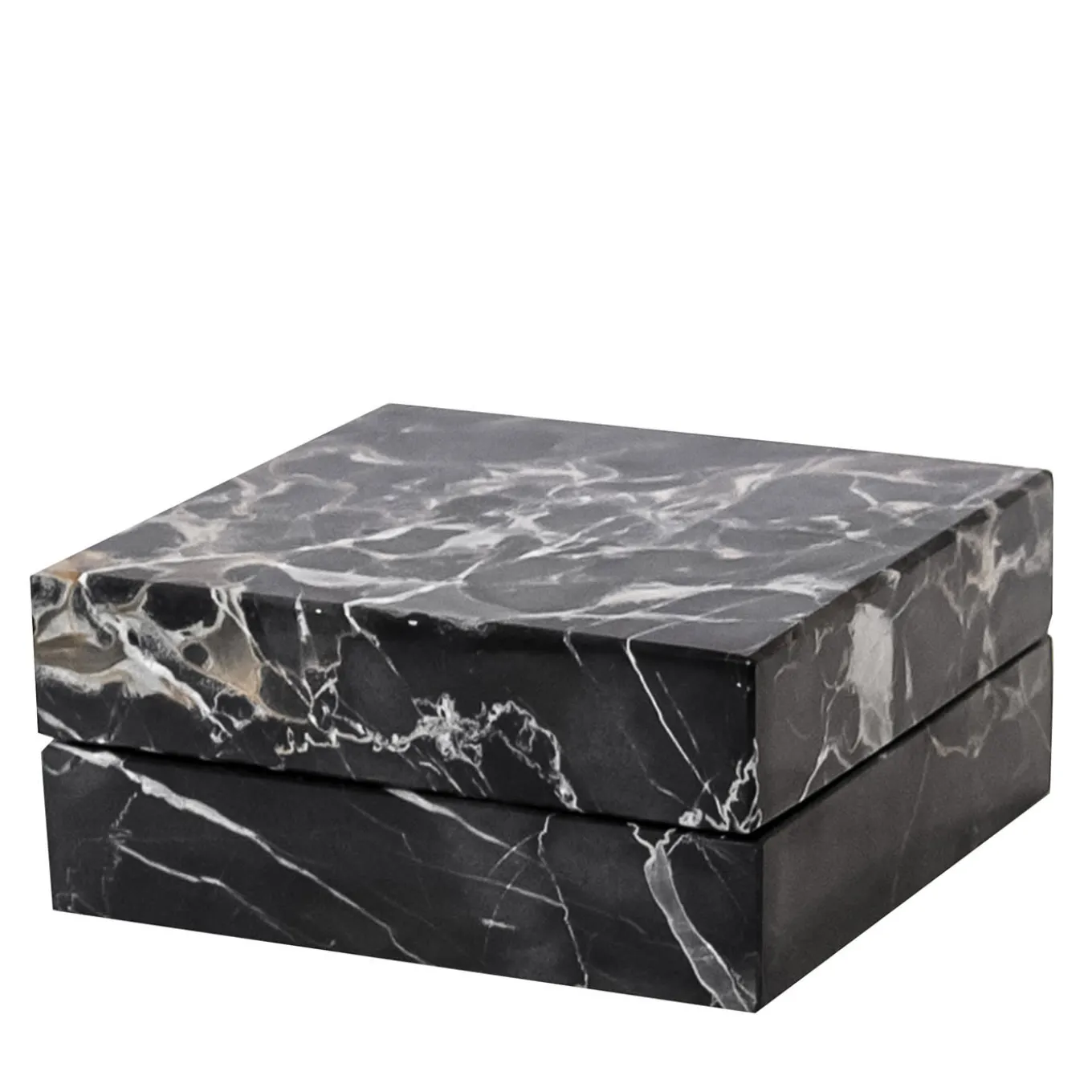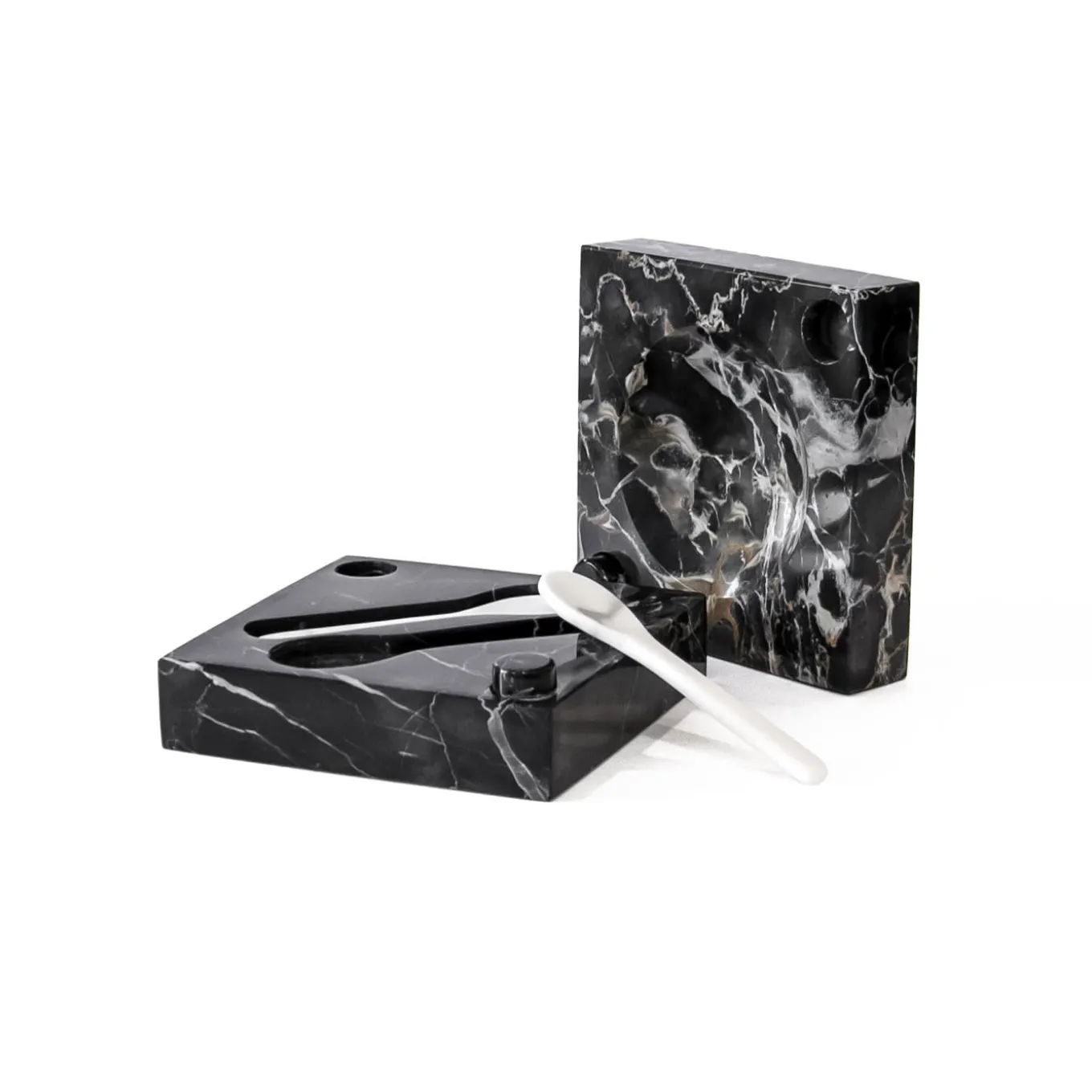 Porta caviale con cucchiai in marmo Portoro e bianco di Carrara. Ogni pezzo è in qualche modo unico (ogni blocco di marmo è diverso per venature e sfumature) e realizzato a mano da artigiani italiani specializzati da generazioni nella lavorazione del marmo. Lievi variazioni di forma, colore e dimensione sono da considerarsi garanzia di una creazione artigianale. È importante non usare limone o aceto su di esso, pulire solo con acqua e sapone naturale (come il sapone di Marsiglia), non metterlo in lavastoviglie.