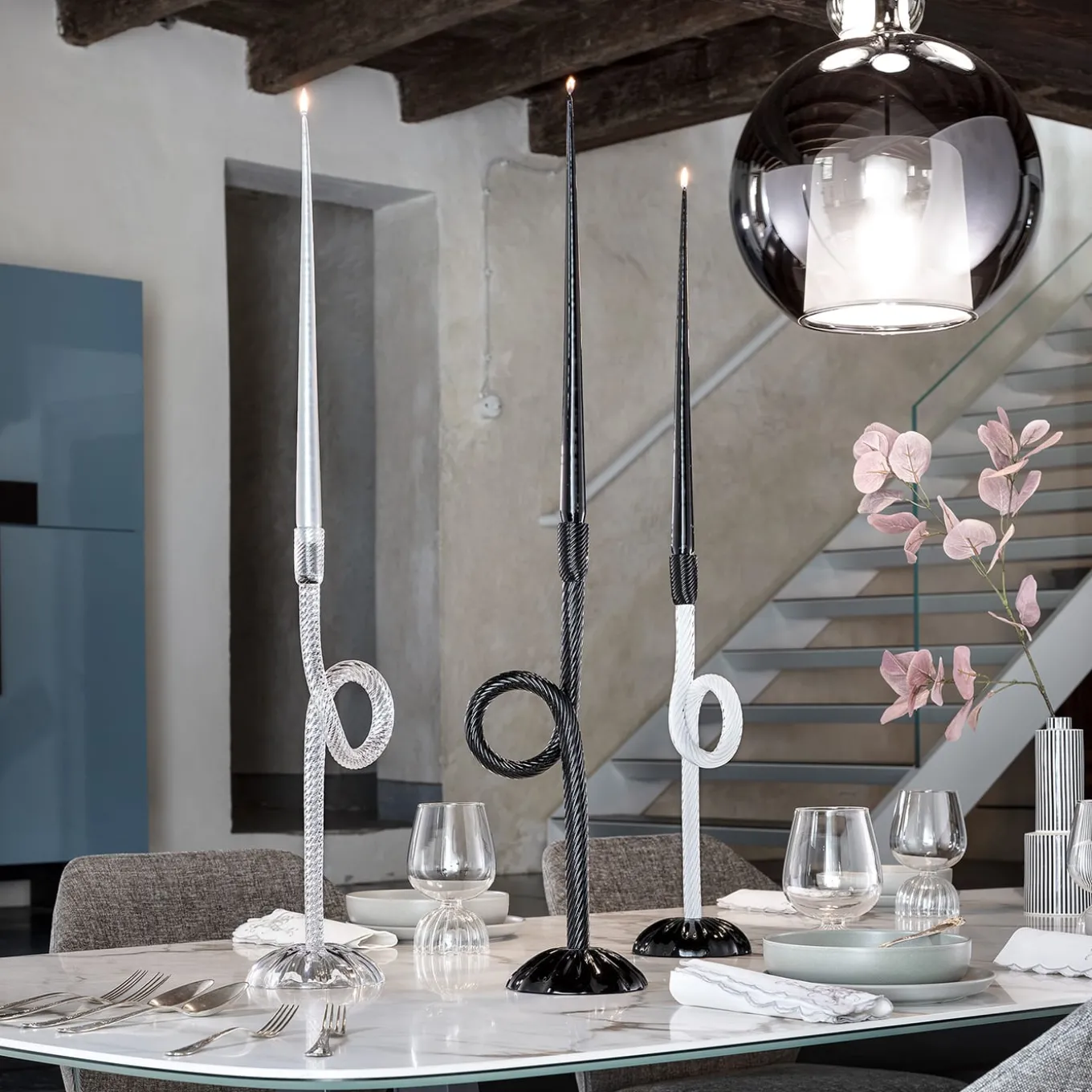 Aina Kari rende omaggio alla città lagunare di Venezia. I nodi e le corde fanno parte della vita quotidiana veneziana, questo portacandele originale e contemporaneo mette in evidenza l’abilità di torcere il vetro soffiato a 360 gradi.