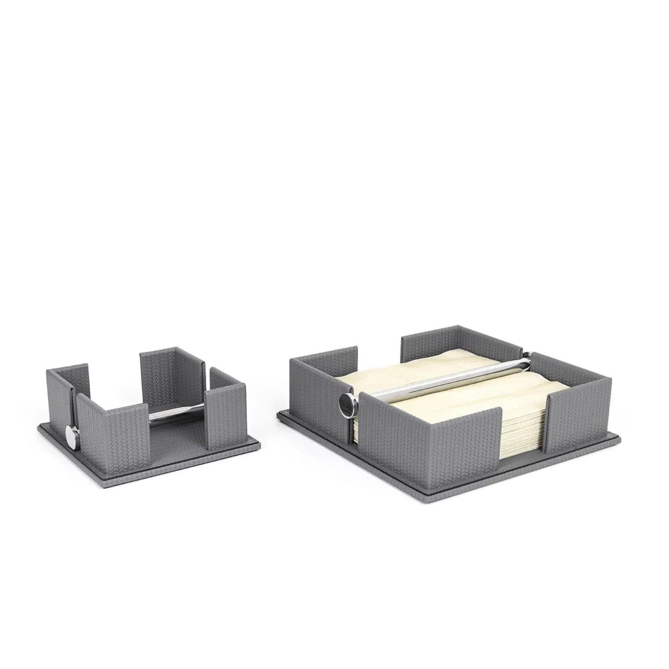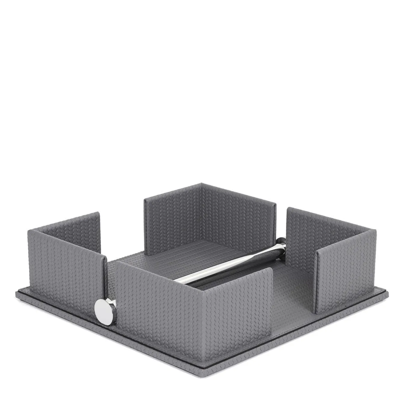 Il portatovaglioli in pelle grigia ha un peso in ottone satinato o cromato, con finitura intrecciata. Perfetto per tovaglioli piccoli e grandi, è in grado di contenere formati 12×12 cm o 20×20 cm. Disponibile in diversi colori e pelli. Contattare il concierge per maggiori informazioni.