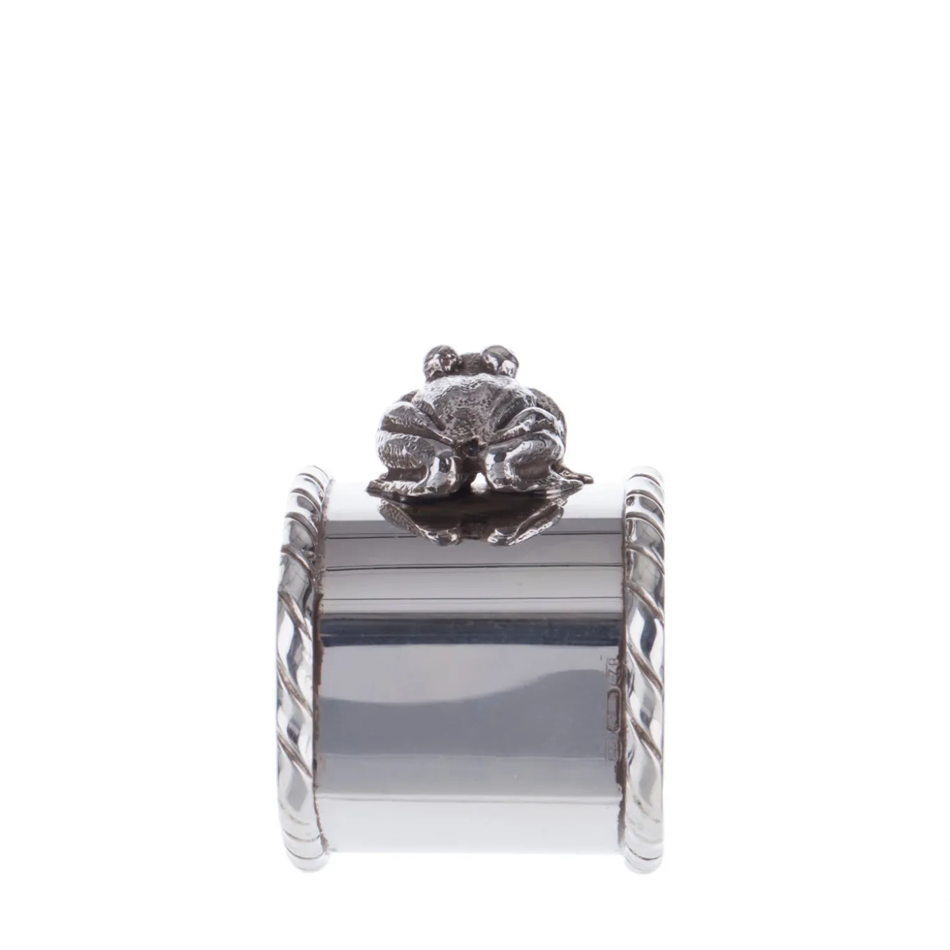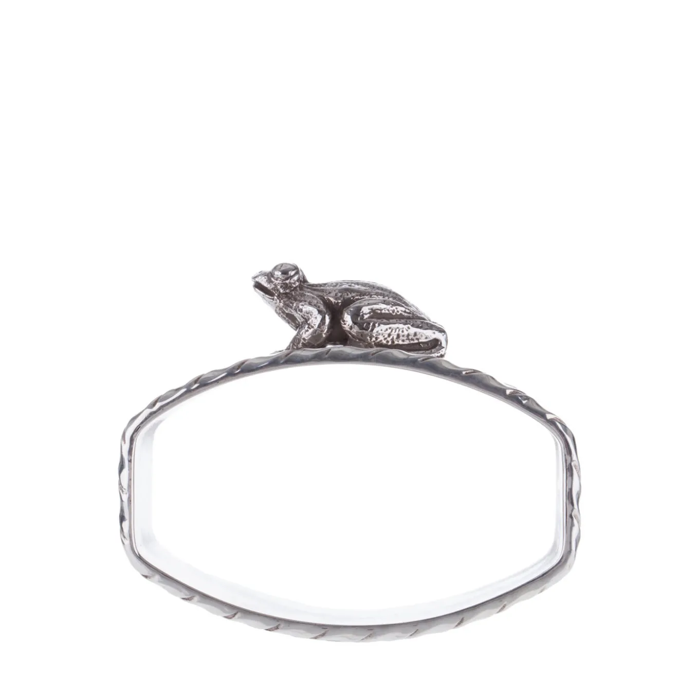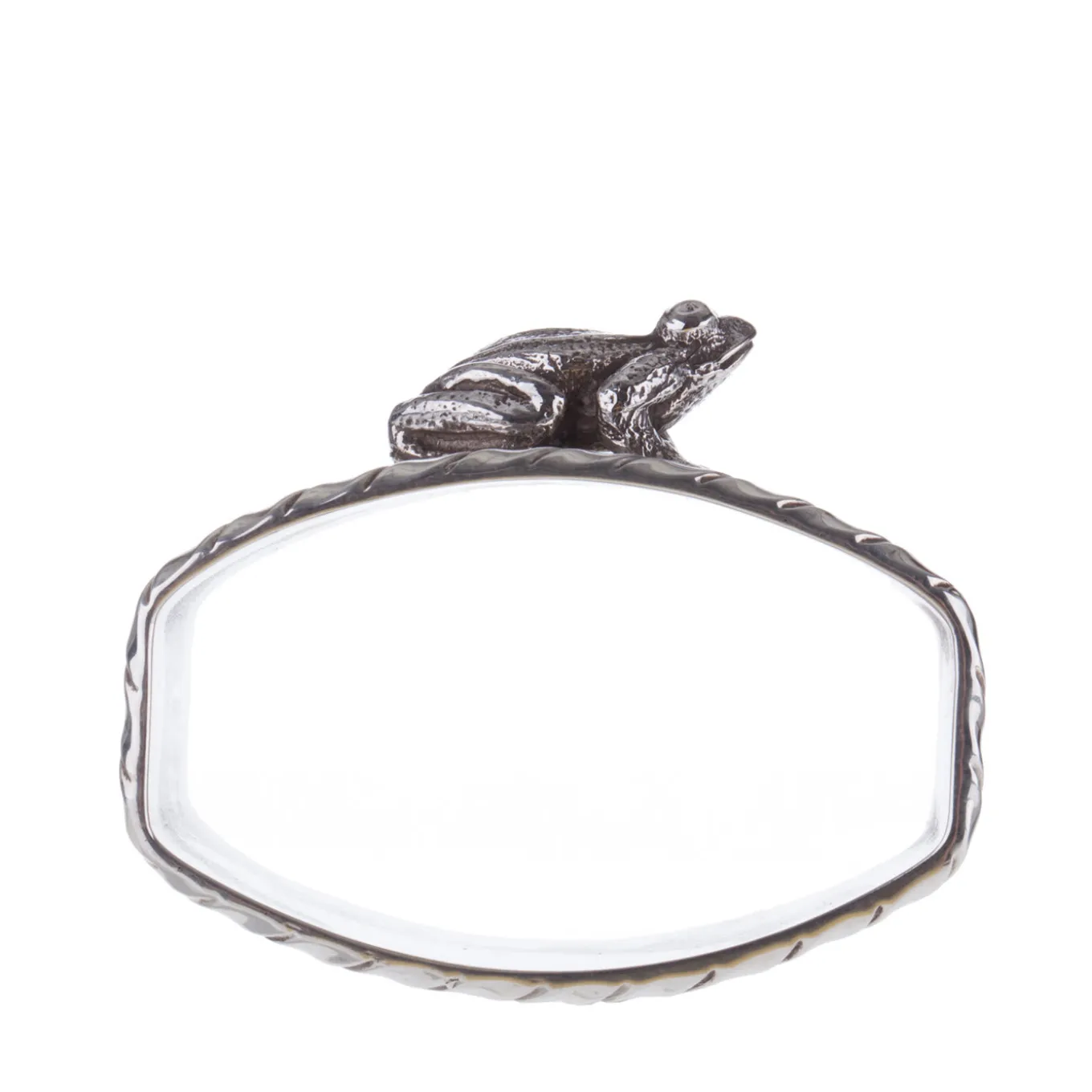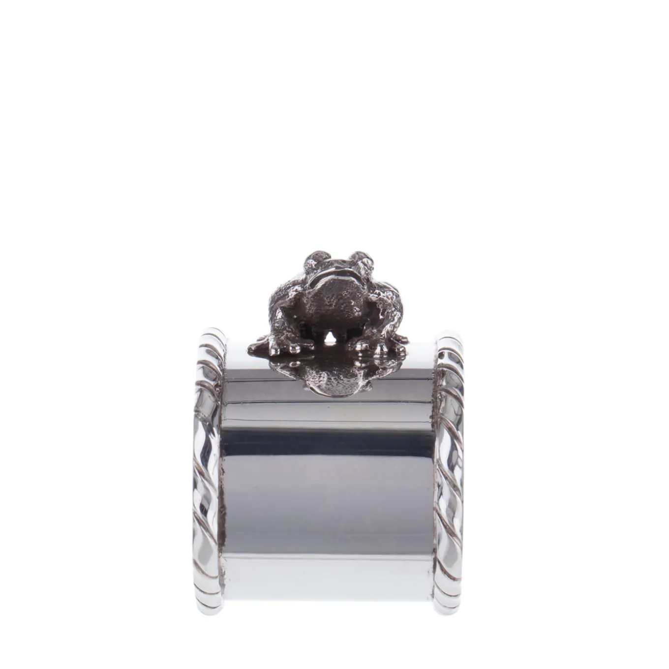 Anello portatovagliolo in argento massiccio, realizzato dagli argentieri fiorentini Pagliai. Il pezzo presenta un bordo in stile San Marco e una graziosa statuetta di rana creata con la tecnica della fusione a cera persa. Pagliai offre diversi portatovaglioli ispirati agli animali, che possono essere mescolati e abbinati secondo i propri gusti.