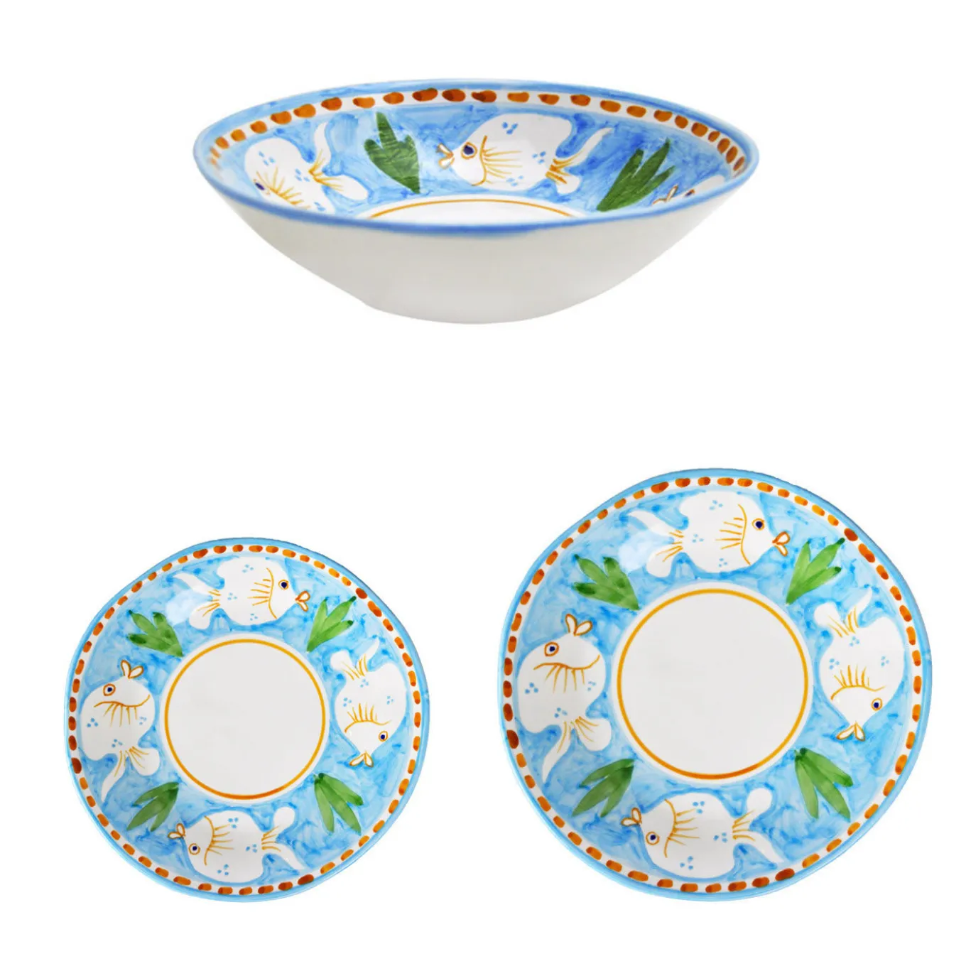 Realizzato in pregiata ceramica, questo affascinante set ispirato alle atmosfere marine – da cui il nome Poseidon, il dio greco del mare – comprende sei piatti da portata (ø 29 cm), sei piatti fondi (ø 23 cm) e sei piatti da dessert (ø 23 cm). Ogni pezzo è decorato con pesci bianchi su sfondo turchese alternati a grappoli di alghe verdi. Ulteriori e graziosi dettagli color ocra arricchiscono il valore decorativo del set.