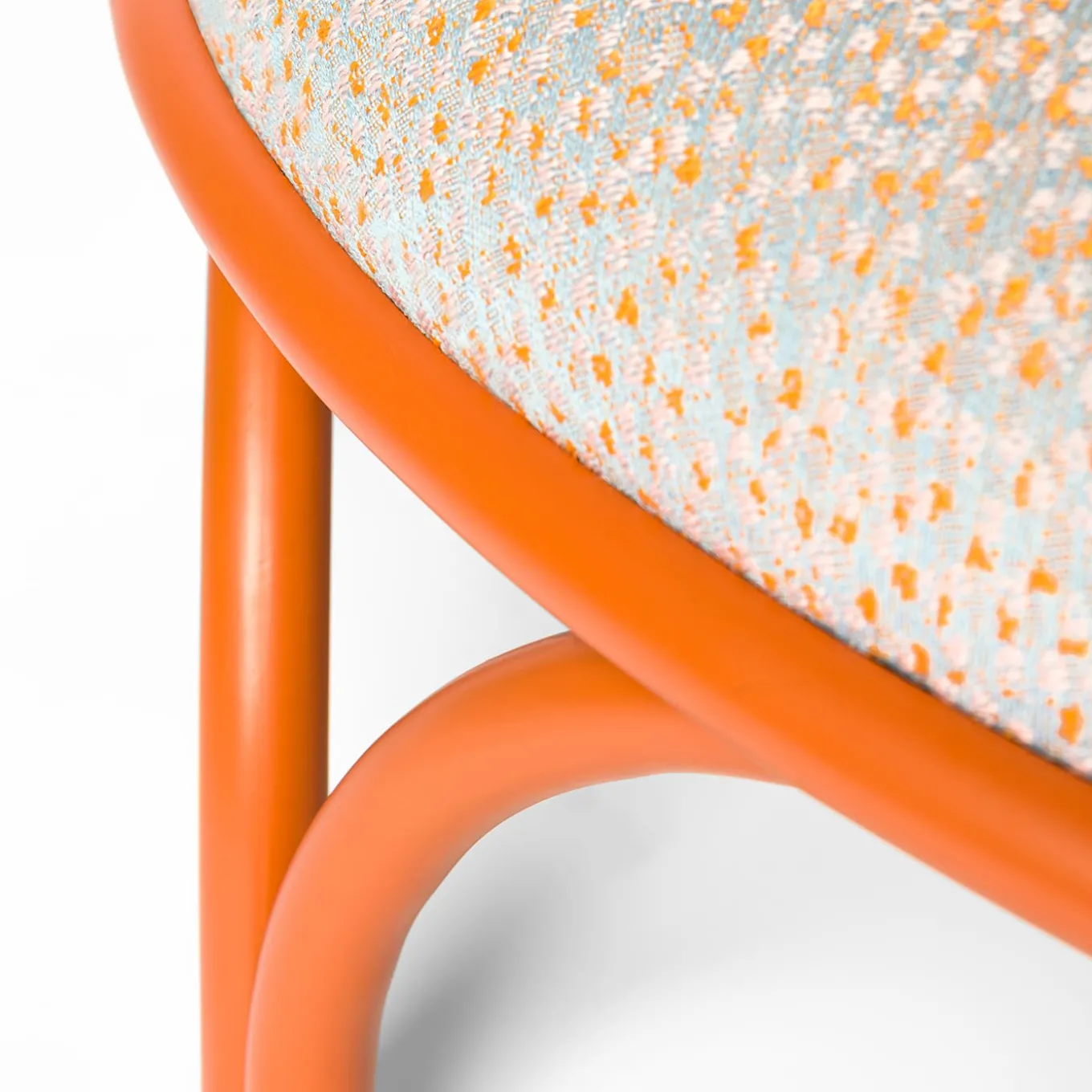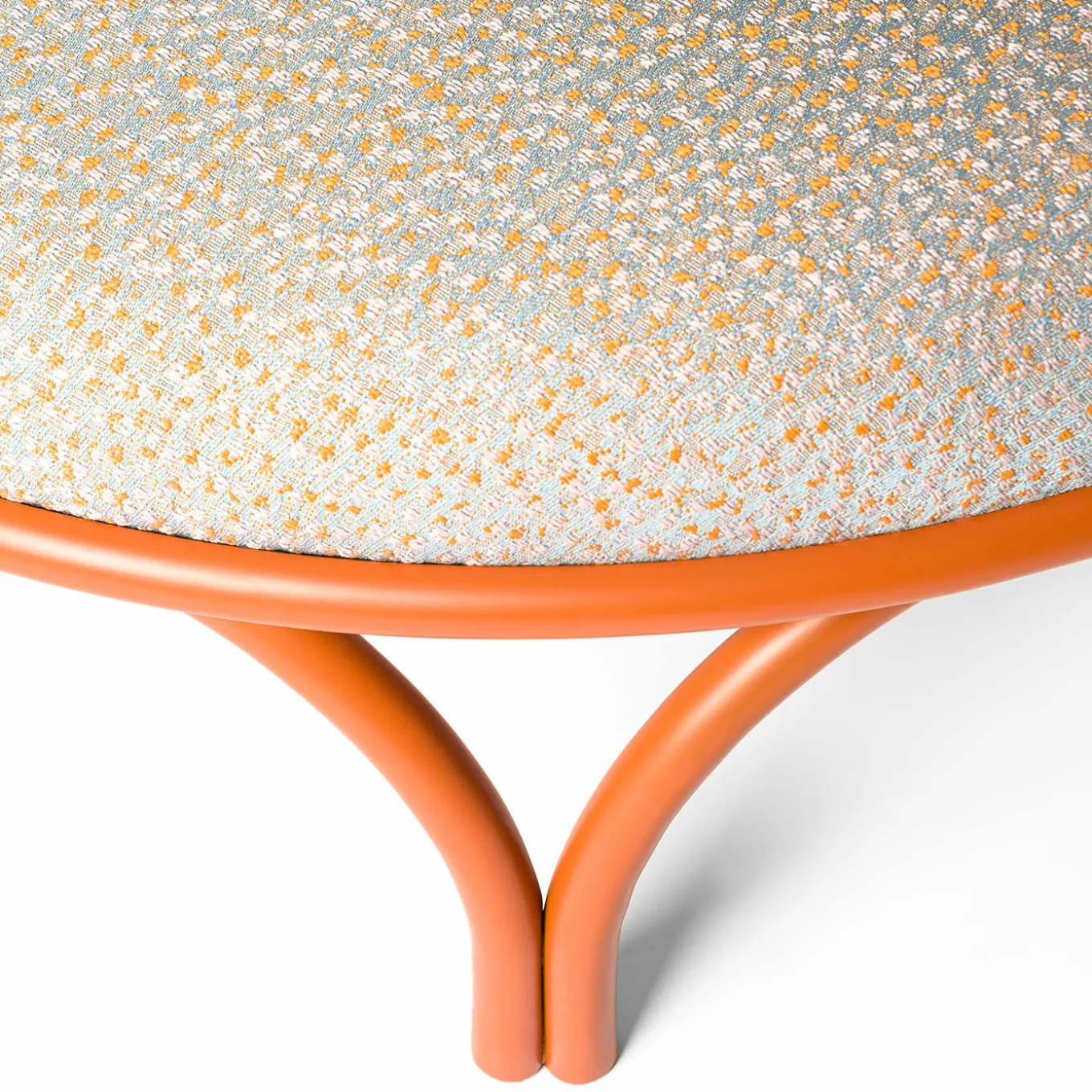 Incontro sublime di linee sinuose e movimento dinamico, questo eccezionale pouf rotondo sfoggia un design giocoso. Realizzato a mano in legno curvato e laccato arancione, presenta una seduta ampia e accogliente, morbidamente imbottita e rivestita in tessuto. Creato in collaborazione con la designer Serena Confalonieri, si inserisce senza problemi in ambienti privati e contract di qualsiasi ispirazione.