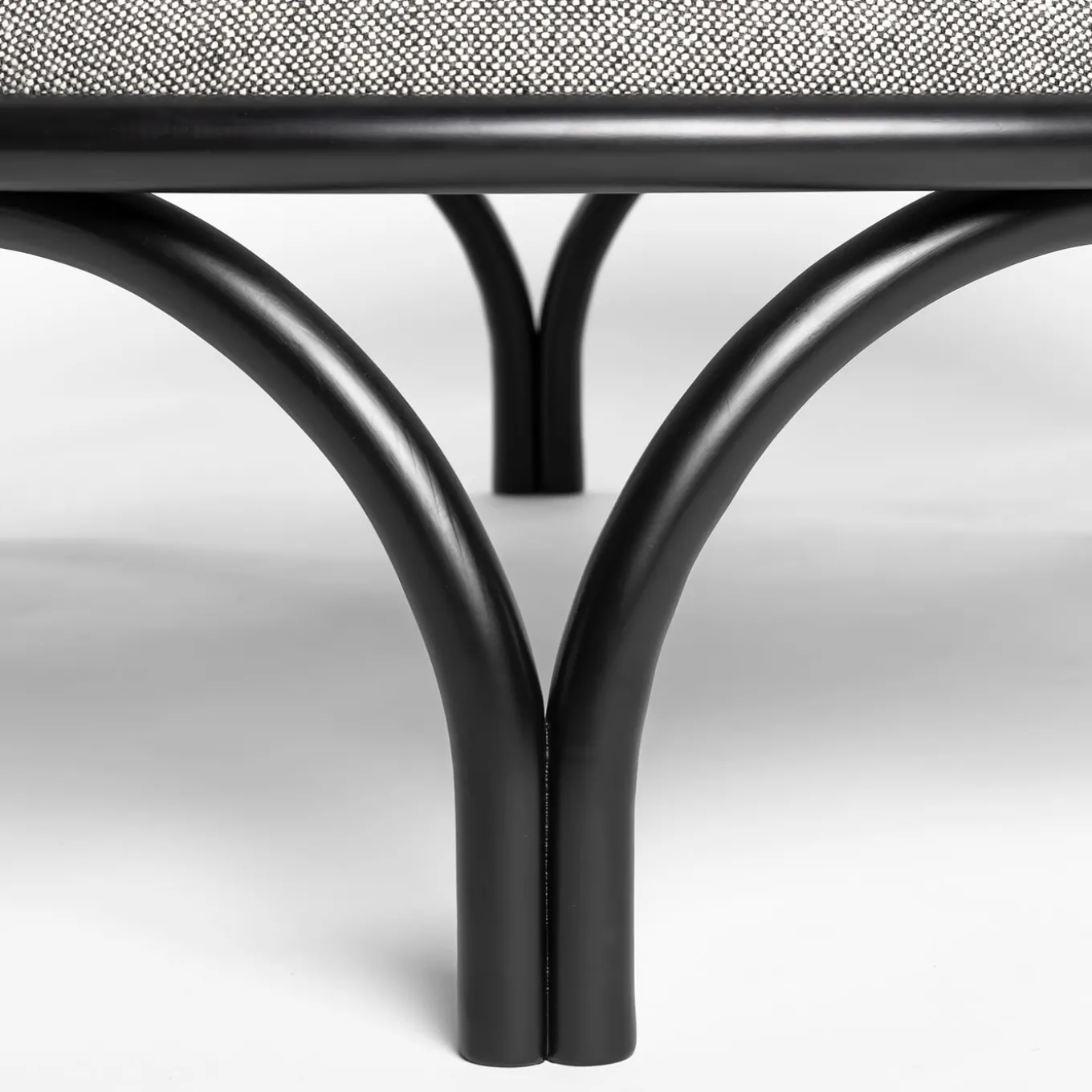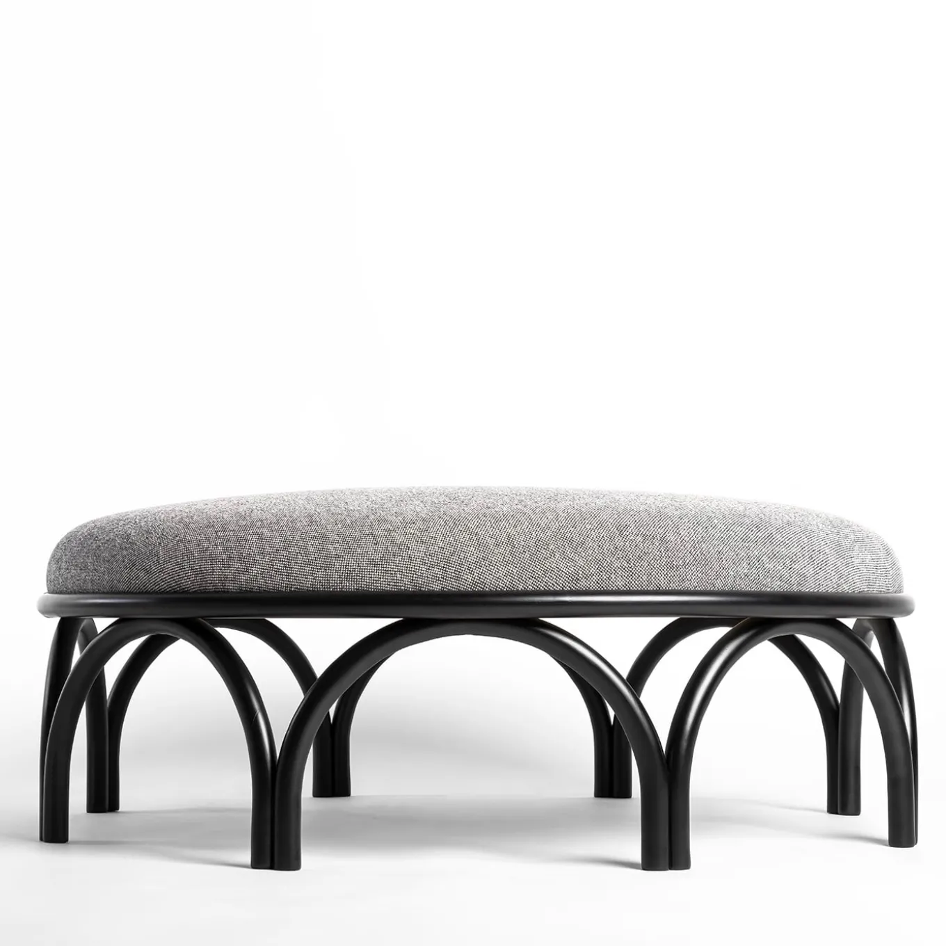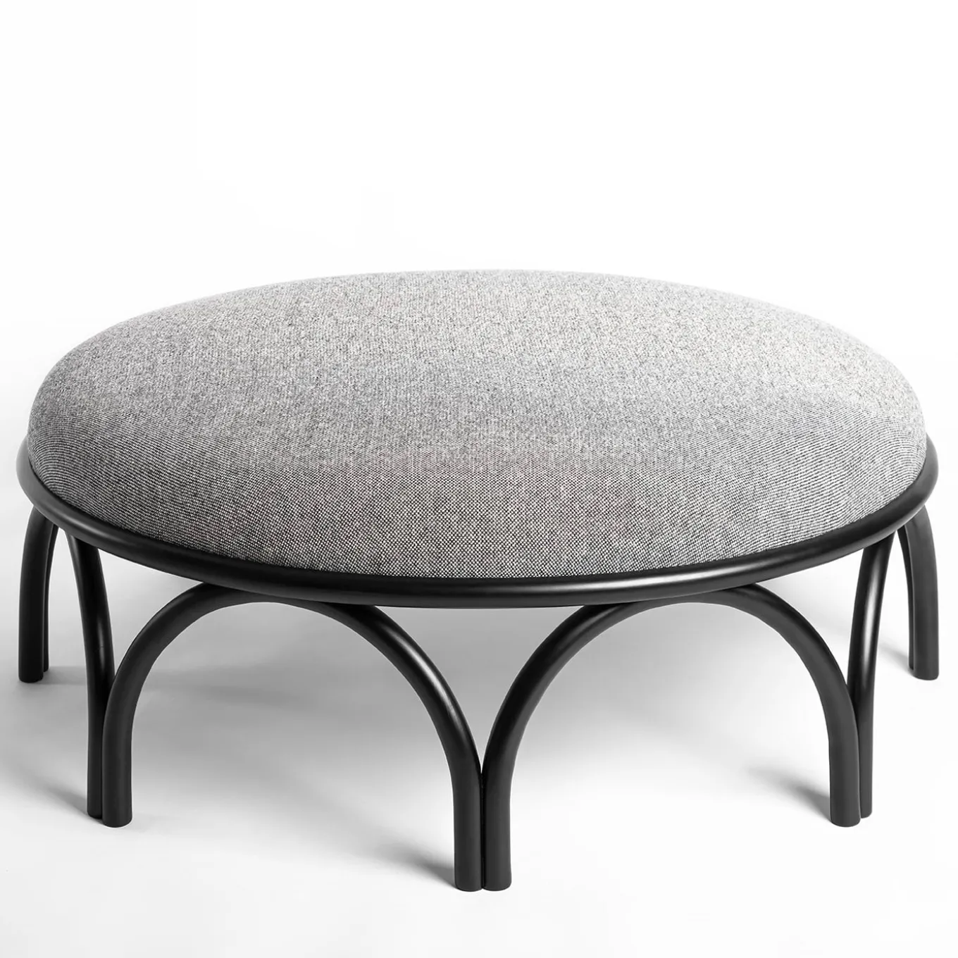 Incarnazione iconica dell’incontro tra linee classiche e movimento dinamico moderno, questo splendido pouf rotondo si distingue per il suo design giocoso. Realizzato a mano in legno curvato e laccato nero, presenta un’accogliente seduta morbidamente imbottita e rivestita in tessuto. Disegnato da Serena Confalonieri, sarà un accattivante pezzo d’accento per arredamenti privati e contract.