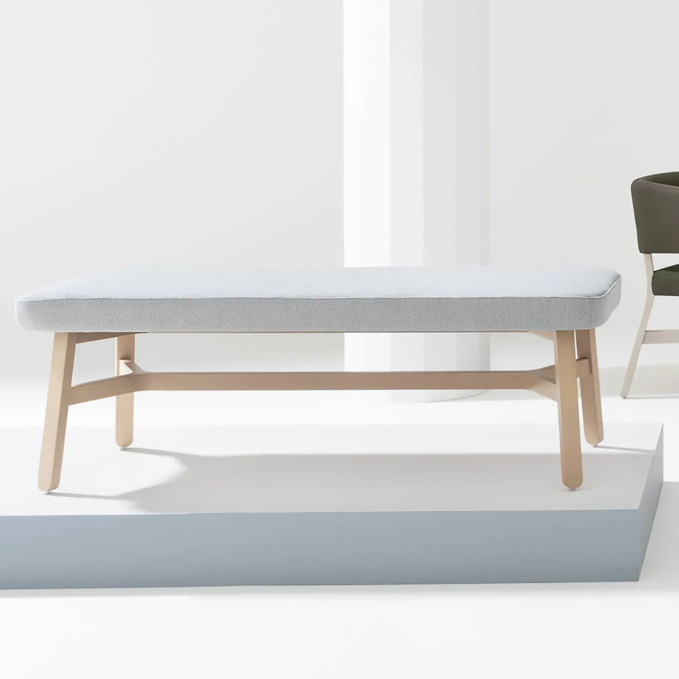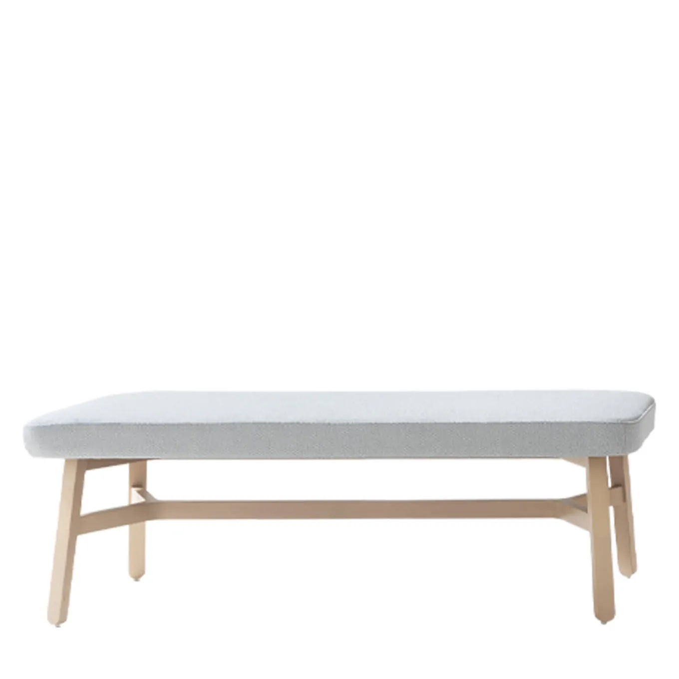 Questo esclusivo pouf, che emana una sensibilità moderna, colpisce per la sua estetica pulita che bilancia linee semplici e tonalità delicate. Realizzato in faggio che mantiene il suo aspetto naturale, la struttura comprende quattro gambe inclinate collegate da un elemento orizzontale che si divide in due alle estremità. Il sedile rettangolare appoggiato sopra è generosamente imbottito e rivestito in tessuto grigio chiaro. Su richiesta sono disponibili le certificazioni contract e commerciali.