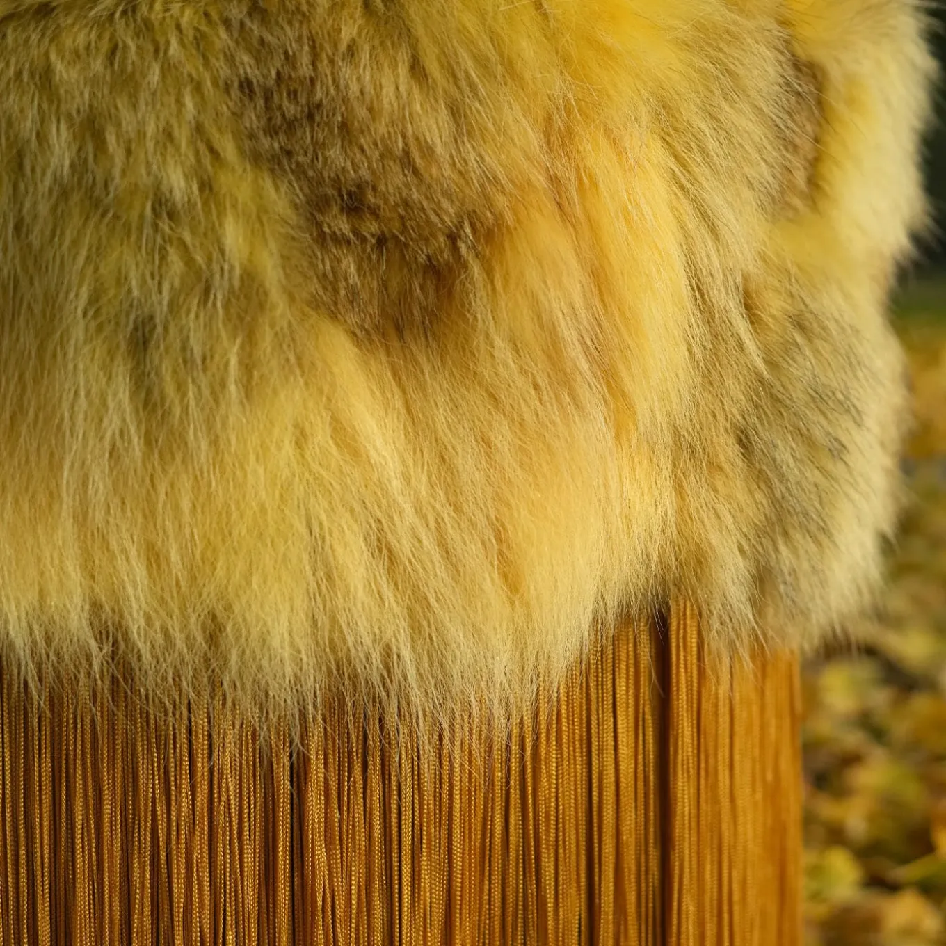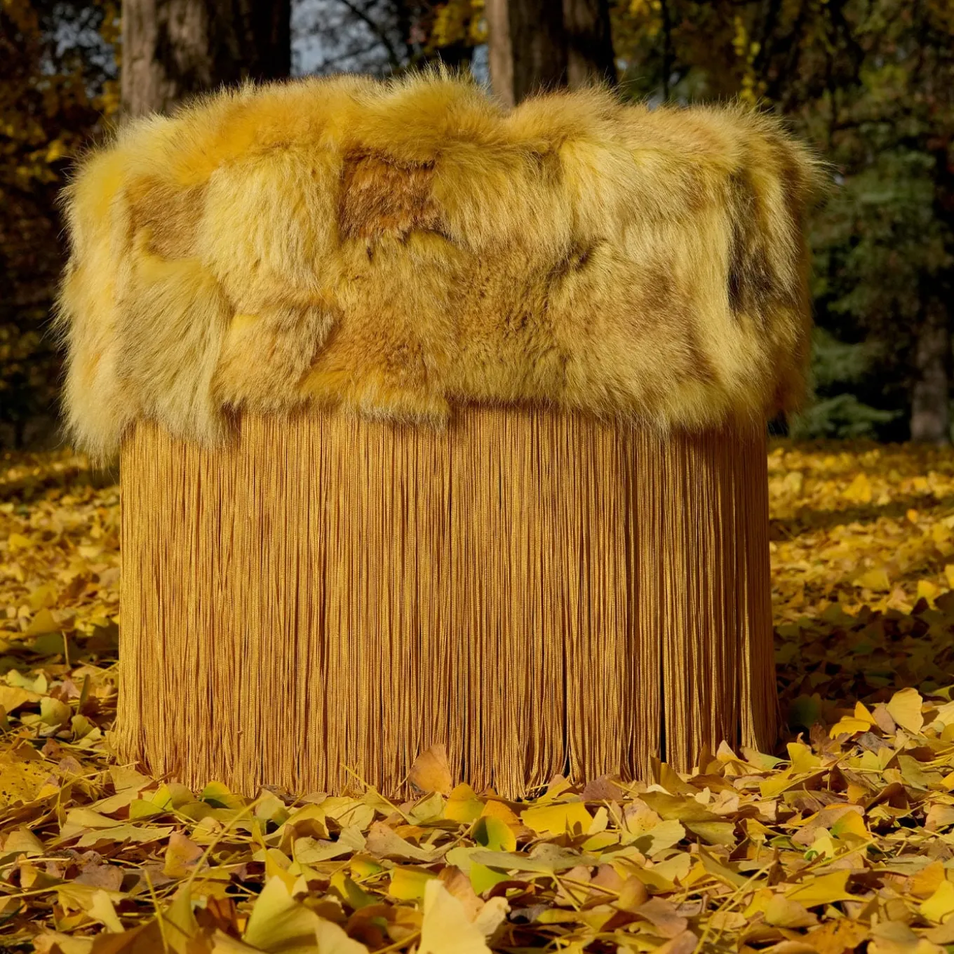 Lorenza Bozzoli Couture presenta una collezione in edizione limitata caratterizzata da un design estremamente morbido, eclettico e decisamente retrò. La nuova Fur Collection propone i pezzi iconici di Couture in versione pelosa, con colori ispirati agli anni Settanta e sofisticati rivestimenti in pelliccia che enfatizzano le forme avvolgenti e morbide per un effetto cocoon. Pouf in patchwork di pelliccia di coyote gialla, calda e morbida, con frange gialle. Struttura e gambe in legno di faggio. Edizione limitata di 10 pezzi.