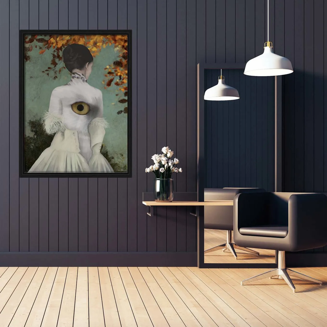 Su una tela pittorica di cotone pregiato con cornice a scatola americana in legno di tiglio, questa splendida opera d’arte in edizione limitata è un’opera pittorica digitale realizzata assemblando fotografie e illustrazioni. L’opera pop-surrealista raffigura un occhio come specchio dell’anima, che trafigge il petto di una donna. La donna si spoglia e scopre un mantello di cigno che la ricopre di morbide piume bianche.