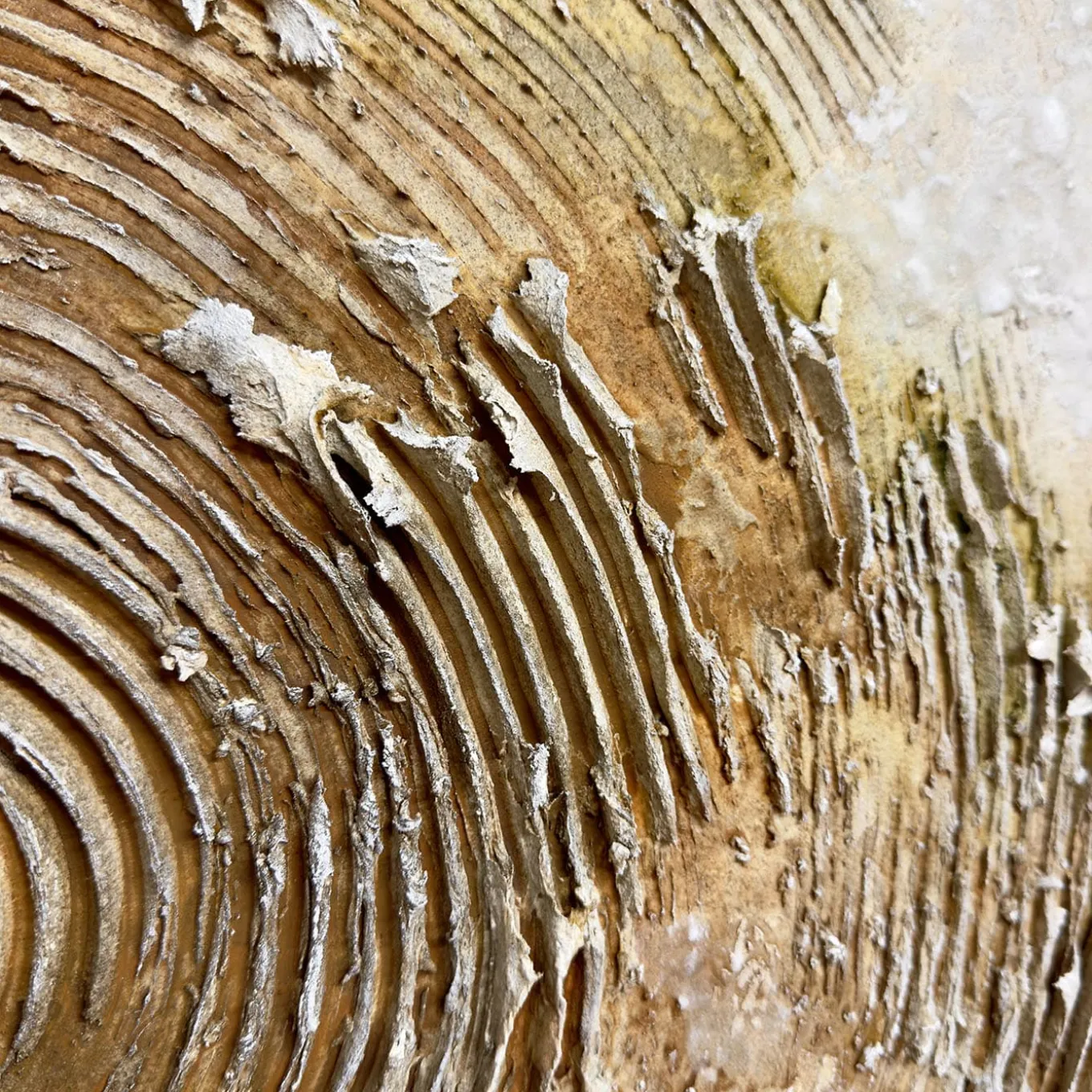 Una meditazione sulla frammentazione e sull’interezza, questo dipinto esprime la tensione dinamica tra l’ordine e il disordine della natura. Il cerchio centrale spezzato simboleggia una relazione in evoluzione tra materia organica e influenza umana. Le sottili transizioni tra i toni della terra bruciata, il verde salvia e l’ocra dorata infondono profondità all’opera. Realizzato con resina e sabbia, bilancia audaci texture in rilievo con finiture morbide ed erose, rendendolo ideale per interni contemplativi o sereni. Pezzo unico.