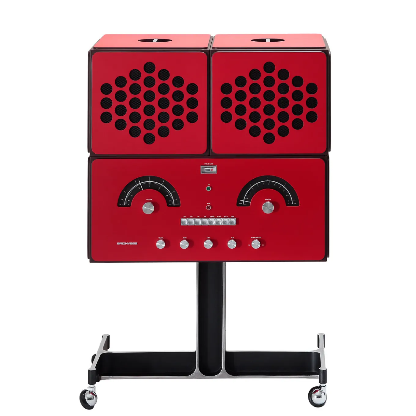 Dinamico e innovativo, con un accento di raffinatezza vintage, questo radiogramma è un progetto del 1965 di Achille e Pier Giacomo Castiglioni. Realizzato con maestria da mani esperte, questo pezzo singolare è realizzato in legno laccato rosso e alluminio. Poggiato su ruote girevoli per facilitarne l’uso e la trasportabilità, è dotato di altoparlanti regolabili, sistema radio AM/FM, giradischi e ingressi AUX.È possibile collegare altre sorgenti e altri sistemi per ricevere segnali audio tramite Wi-Fi e Bluetooth (attraverso dispositivi esterni, non inclusi nel prezzo).