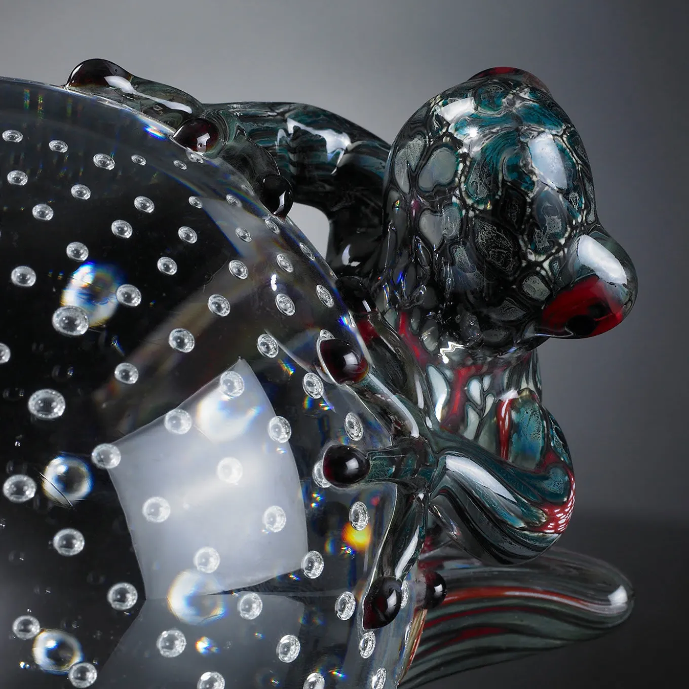 Caratterizzata da un uso unico del colore, questa statuetta presenta una rana verde petrolio dalle sfumature sorprendenti che poggia su una sfera trasparente arricchita da bolle danzanti racchiuse tra gli strati di vetro. Questo oggetto d’arte scultoreo è interamente realizzato a mano in vetro da maestri artigiani.