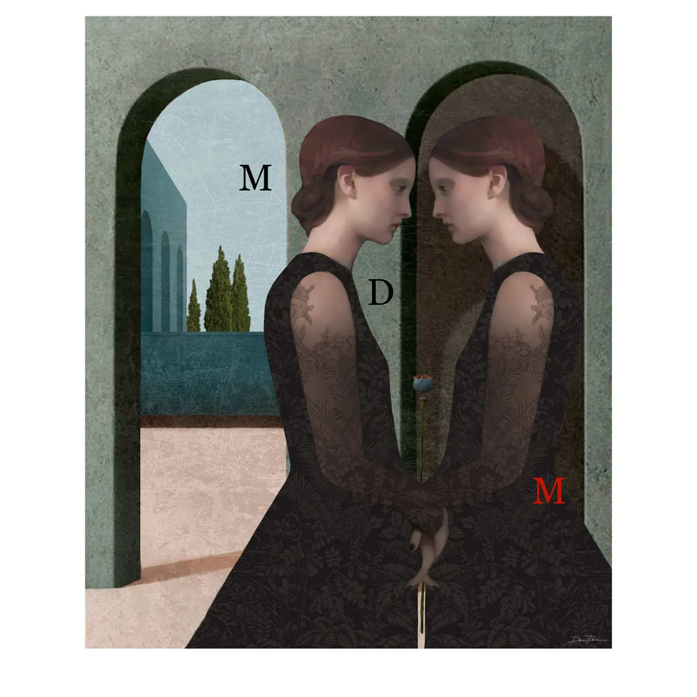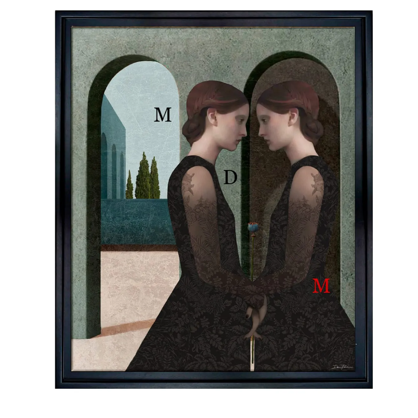 Questa opera originale di Daria Petrilli è una raffinata espressione della sua arte visionaria, che qui fonde elementi di arte metafisica e figure enigmatiche. Un rebus stimolante circonda i profili di due gemelle che si tengono per mano e si guardano negli occhi, creando un senso di calma e di tensione. Stampata su una tela in cotone pregiato e montata su una struttura di pino essiccato di 4 cm di spessore, questa stampa pop-surrealista è accompagnata da una cornice in legno di tiglio e dalla firma dell’artista. Certificato di autenticità incluso