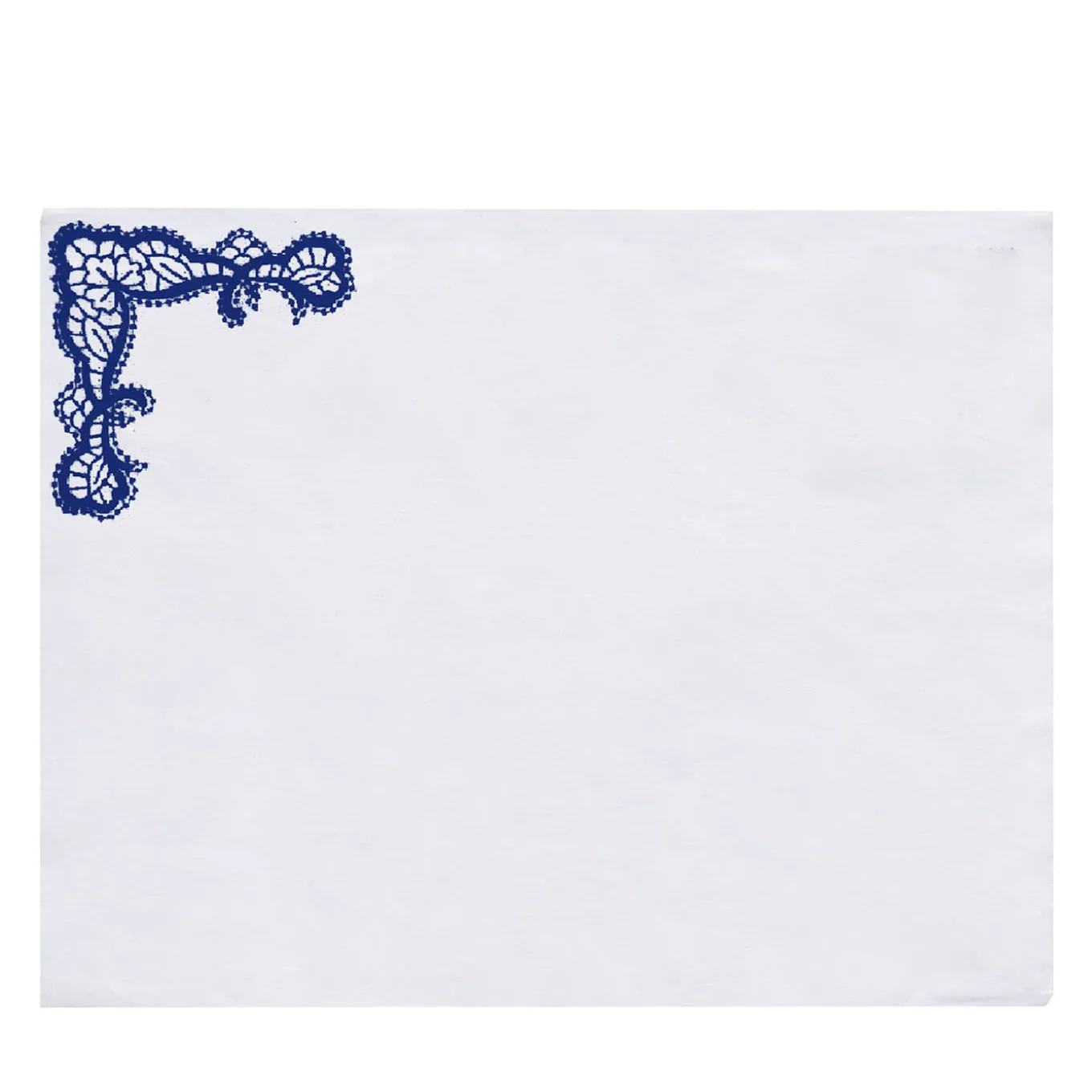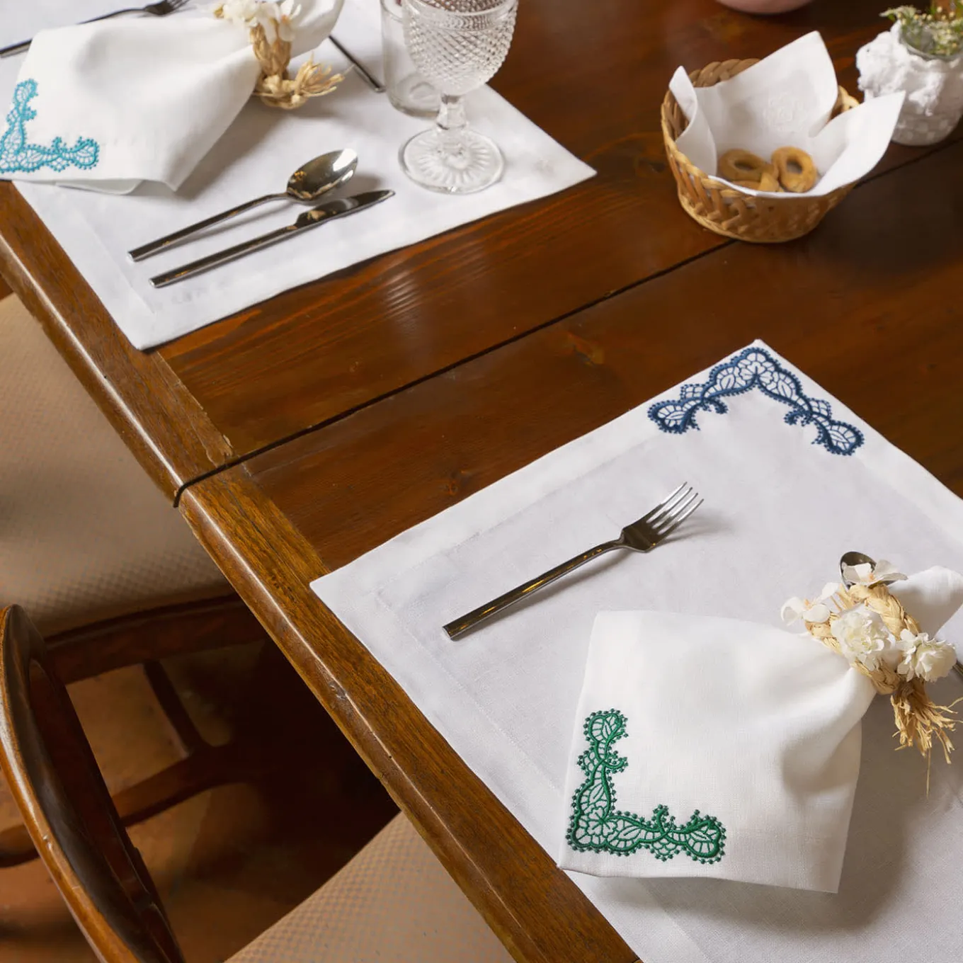 Un sinuoso ricamo in cotone Mako blu vibrante orna l’angolo di entrambe le tovagliette che compongono questo raffinato set di lino. Caratterizzato da dettagli intricati, frutto di lunghe ore di paziente lavoro manuale, il ricamo celebra i disegni tradizionali pugliesi del pizzo noto come Rinascimento, da cui il nome della collezione. Un’ode all’eccellente artigianato e alle radici locali, il set è disponibile anche in diverse varianti di colore.