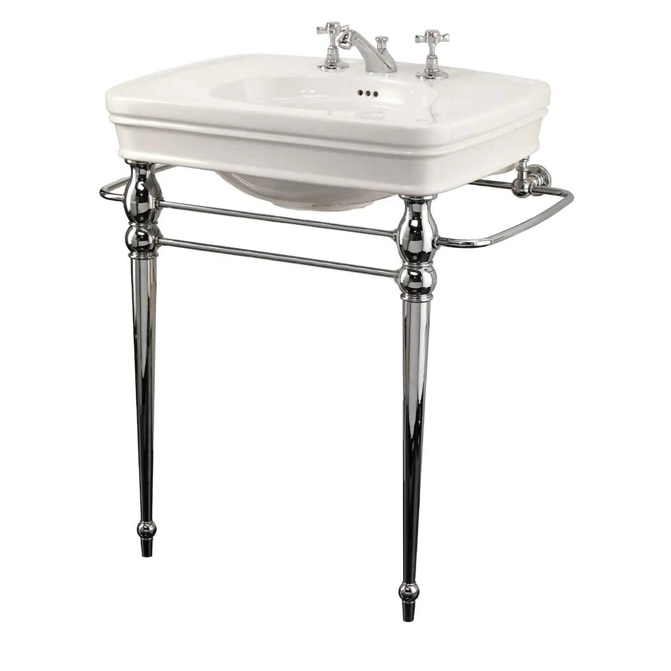 Questa eclettica consolle unisce l’armonica ispirazione classica alle sofisticate atmosfere del miglior design degli anni Cinquanta. La struttura portante in alluminio, con elementi in ottone tornito, è disponibile in diverse finiture. Si completa con l’omonimo lavabo in porcellana, caratterizzato dall’ampia superficie d’appoggio, e con quattro comode barre portasciugamani. Per ulteriori informazioni, contattare il servizio di concierge. La rubinetteria non è inclusa.
