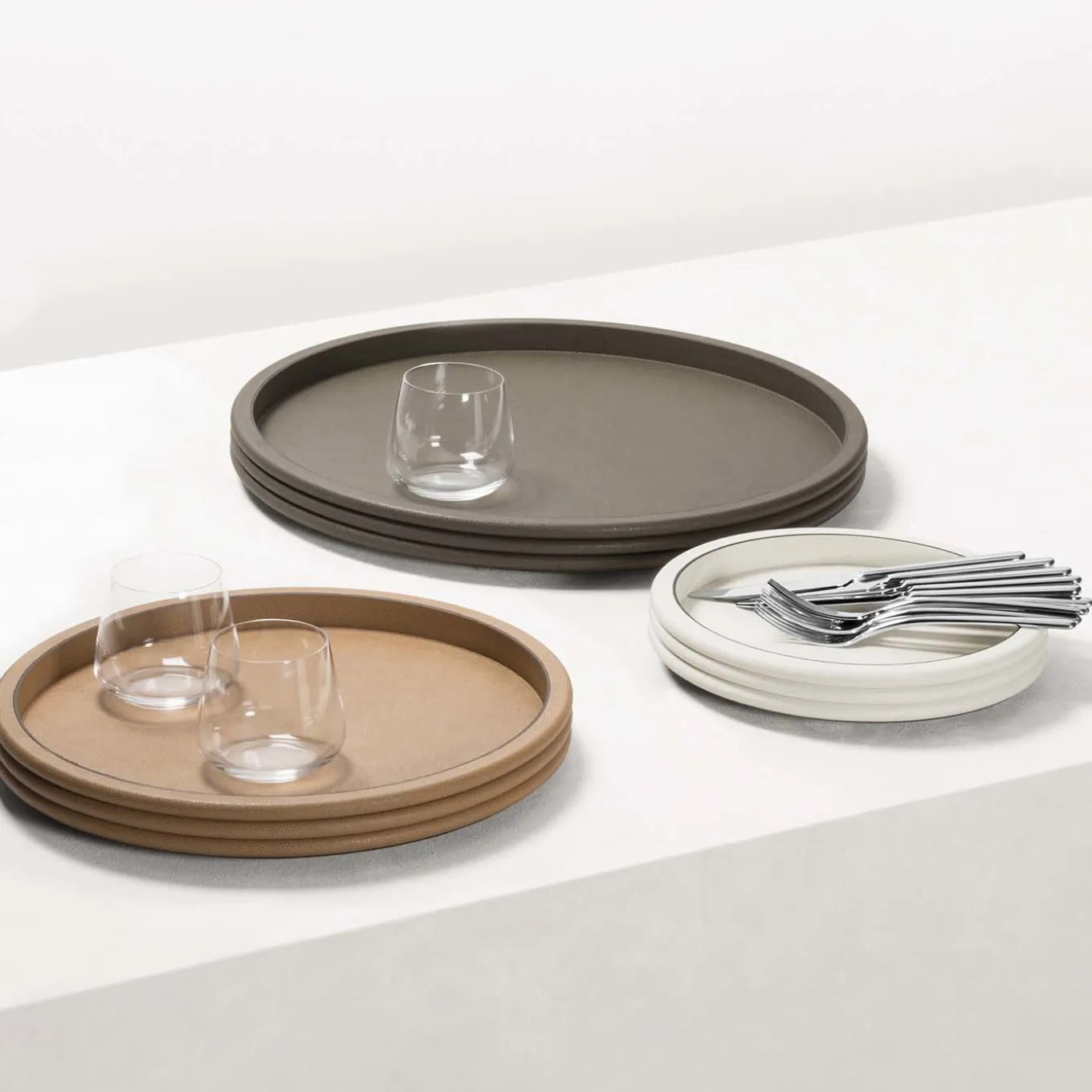 Realizzato in legno e rivestito in pregiata pelle marrone ornata da un profilo nero sulla parte superiore, questo vassoio è composto da tre profondi strati bordati, ispirandosi al famoso tacco a spillo di Salvatore Ferragamo e all’architettura di alcuni edifici italiani.