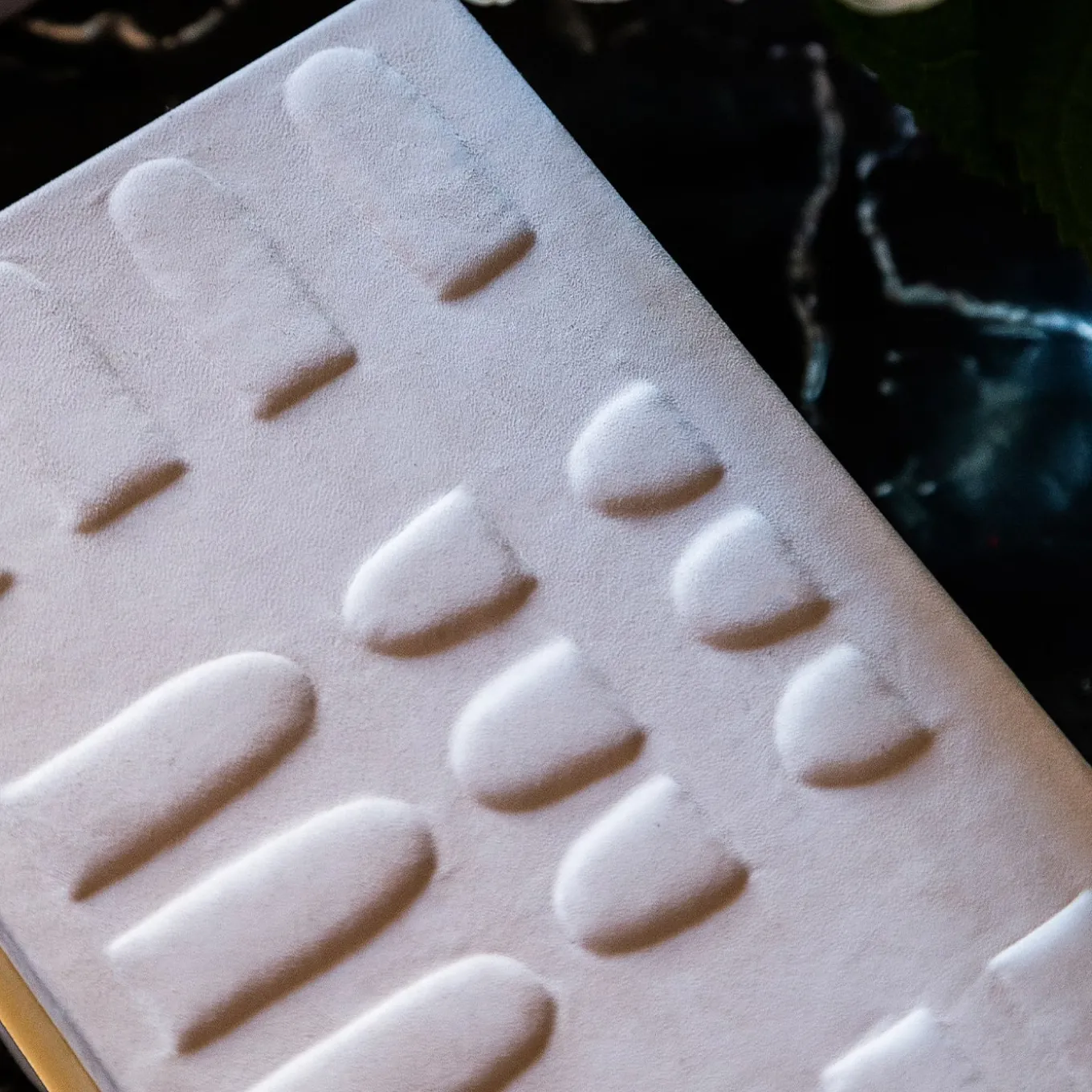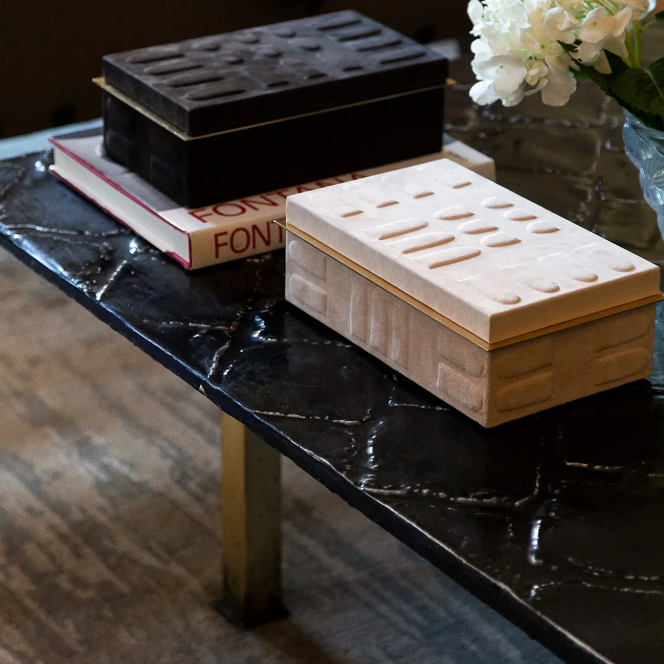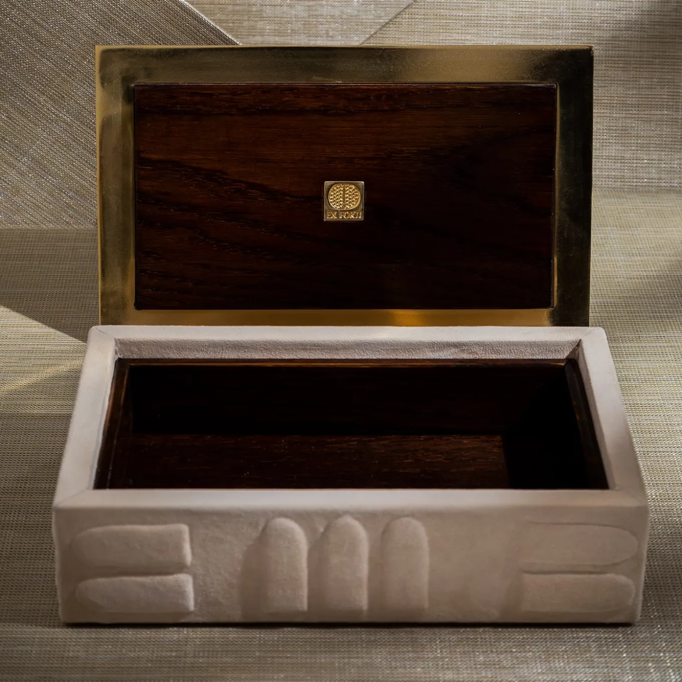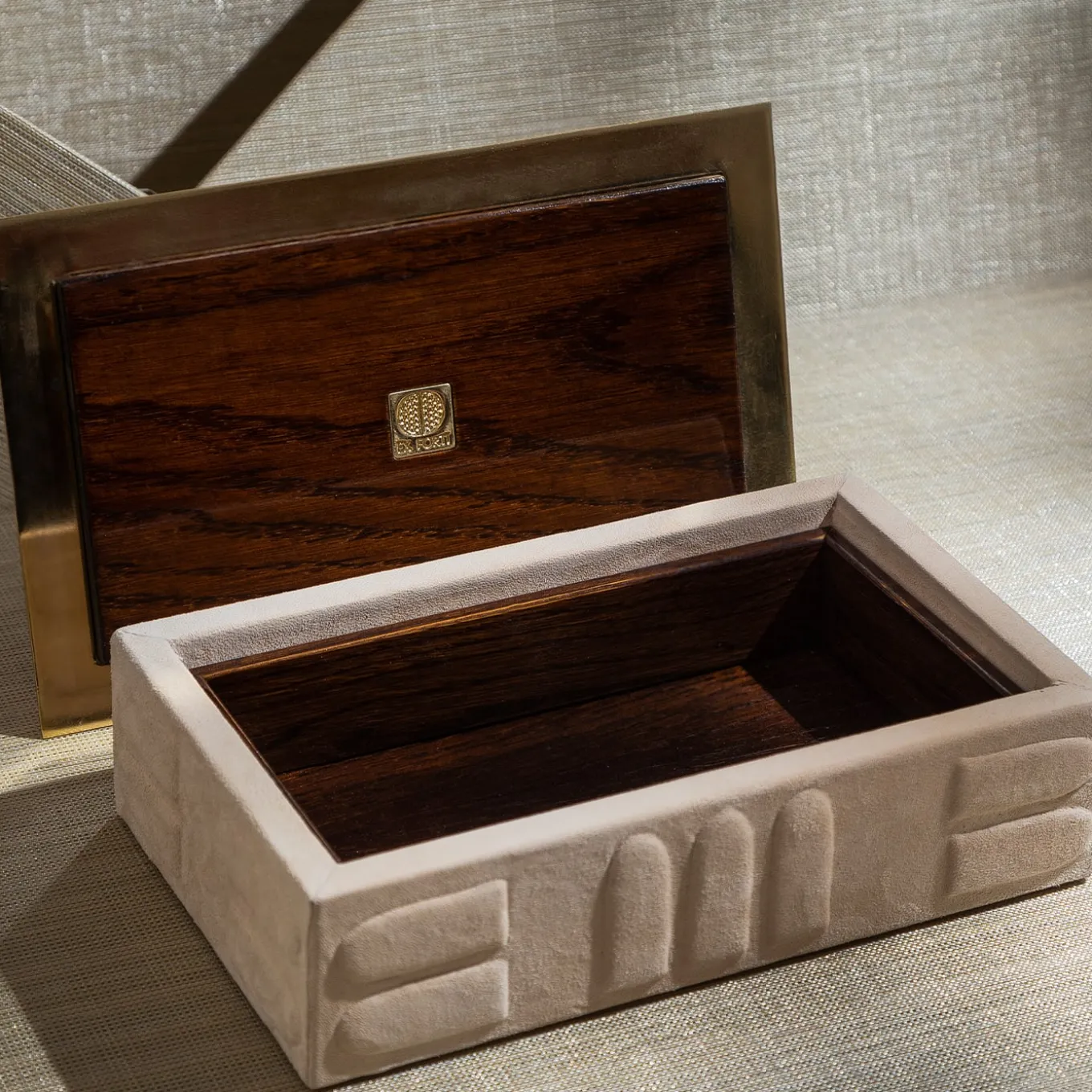 Asat è un capolavoro di raffinata artigianalità. La struttura in massello di noce canaletto del corpo e del coperchio è rivestita in pregiata pelle Nubuck altamente strutturata che esalta l’effetto visivo del pezzo, morbido al tatto e vibrante alla vista. Texture e simboli rimandano alla collezione Bacabs, collocando l’oggetto tra i gentili omaggi alla cultura precolombiana. L’inserto in ottone, lineare e minimalista, fa da contraltare alla sontuosità del pezzo, per un look elegante e raffinato.
