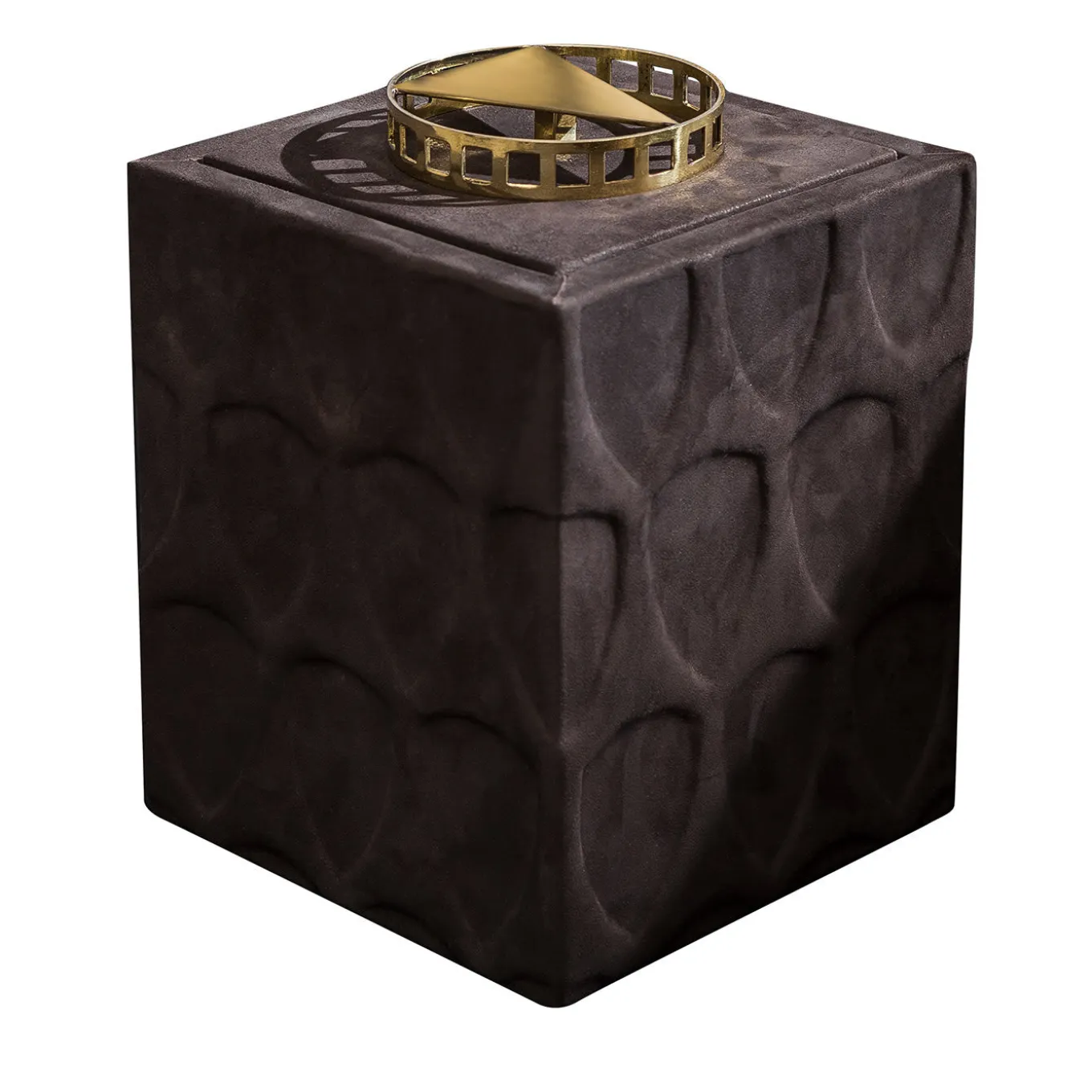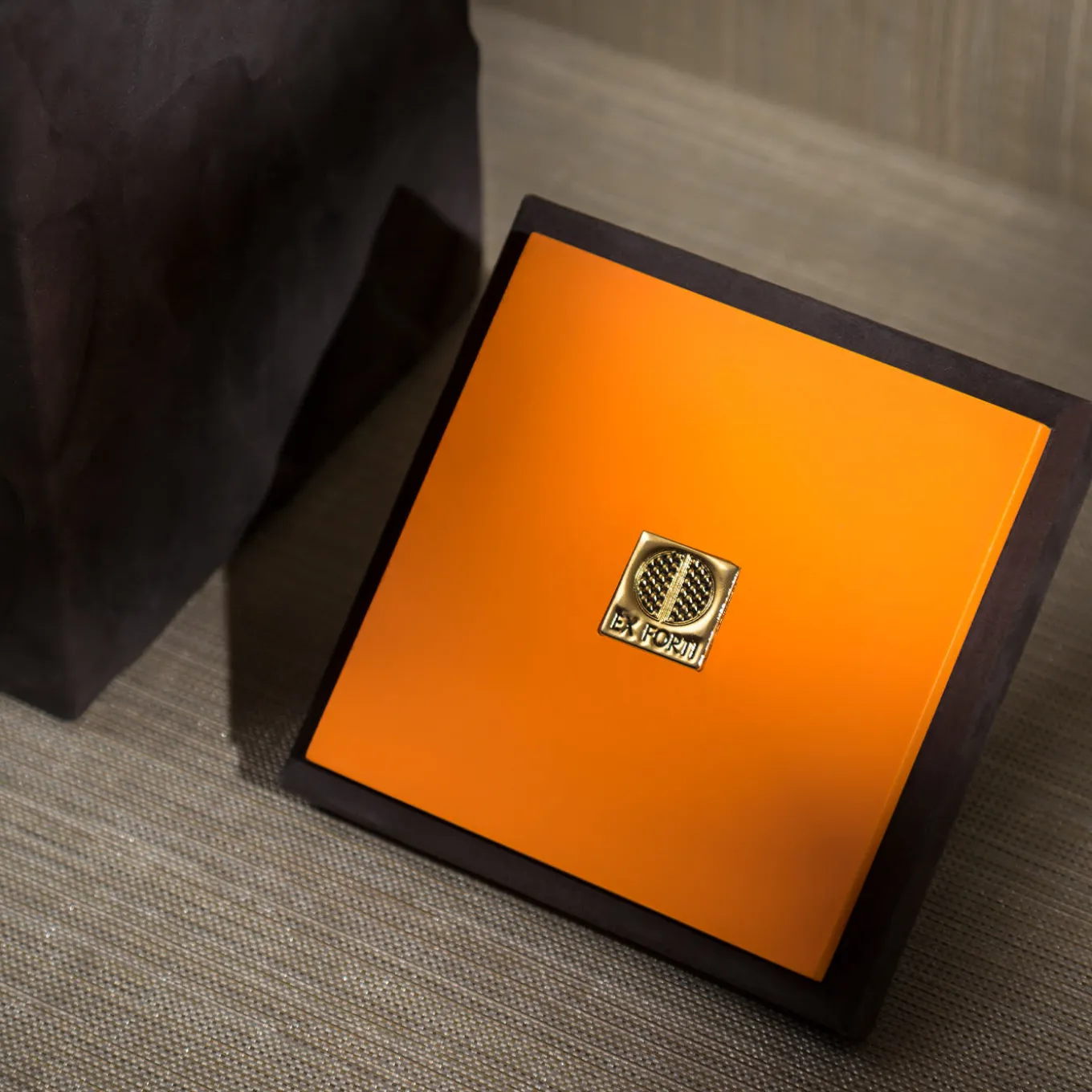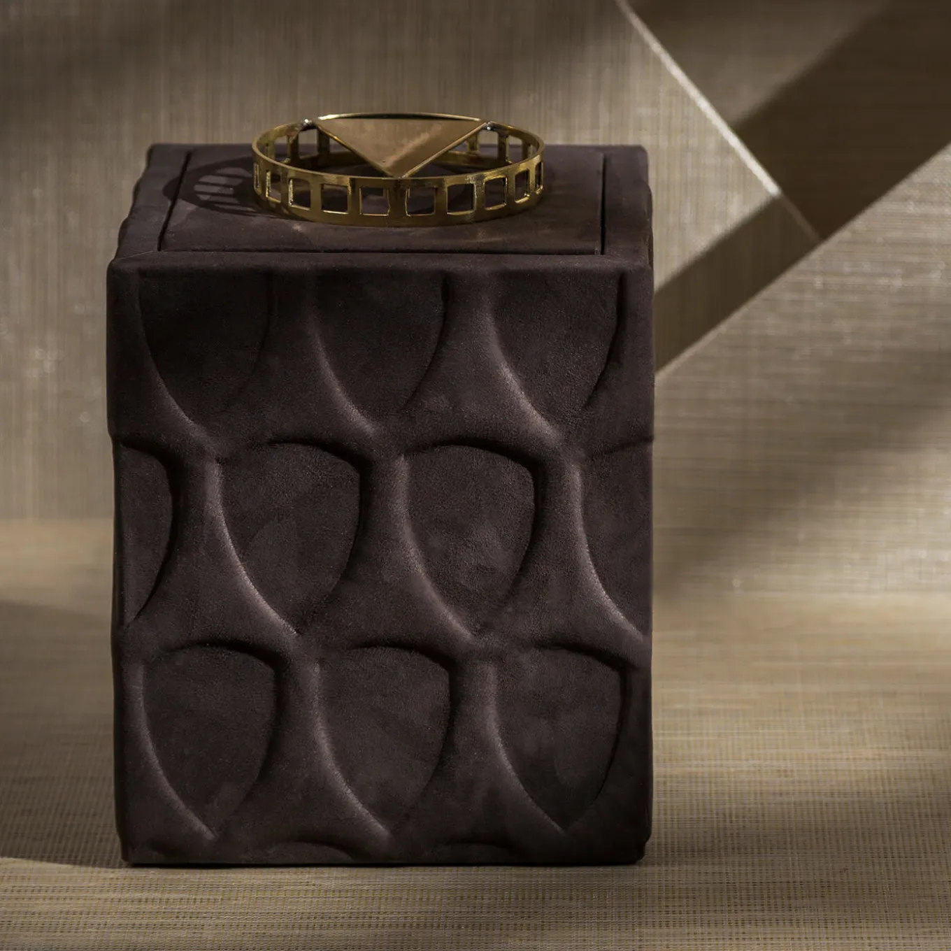 Sapiente sintesi di riferimenti architettonici, questo superbo cofanetto presenta una robusta struttura in legno a forma di parallelepipedo segnata da una ripetuta trama tettonica – un omaggio al Brutalismo – che viene esaltata dalla pregiata pelle Nubuck marrone scuro che lo avvolge completamente come un abito di classe. Il pomello in ottone, simile a un gioiello, permette di sollevare il coperchio per rivelare la lacca arancione interna, suggerendo un elegante riferimento all’architettura della Yale University Art Gallery di Louis Kahn.