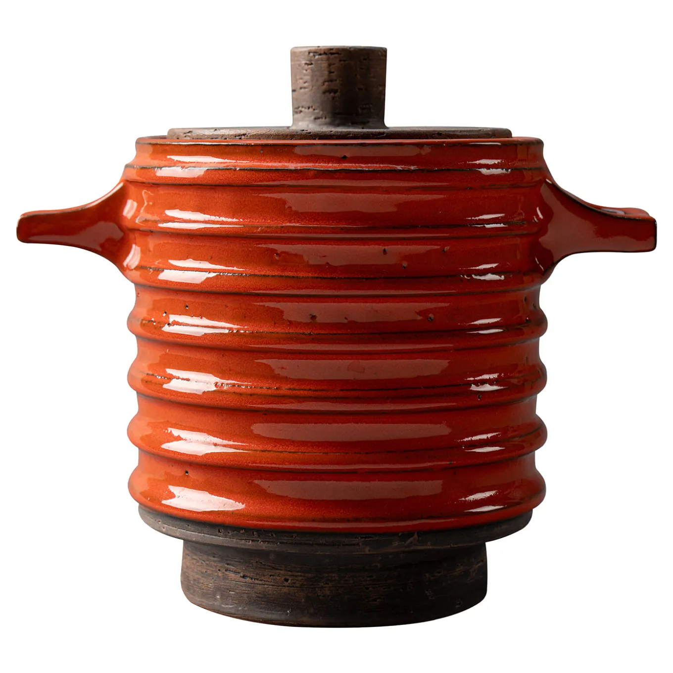 Scatola porta-pipa con coperchio e piccoli manici laterali, progettata per contenere la pipa in modo sicuro. La superficie è incisa orizzontalmente e rifinita con una smaltatura arancione brillante su base marrone, creando un contrasto vivace. Questo pezzo in edizione limitata, parte della riedizione dell’archivio del 2008, è prodotto in 199 esemplari numerati e unisce design funzionale ed espressione artistica.