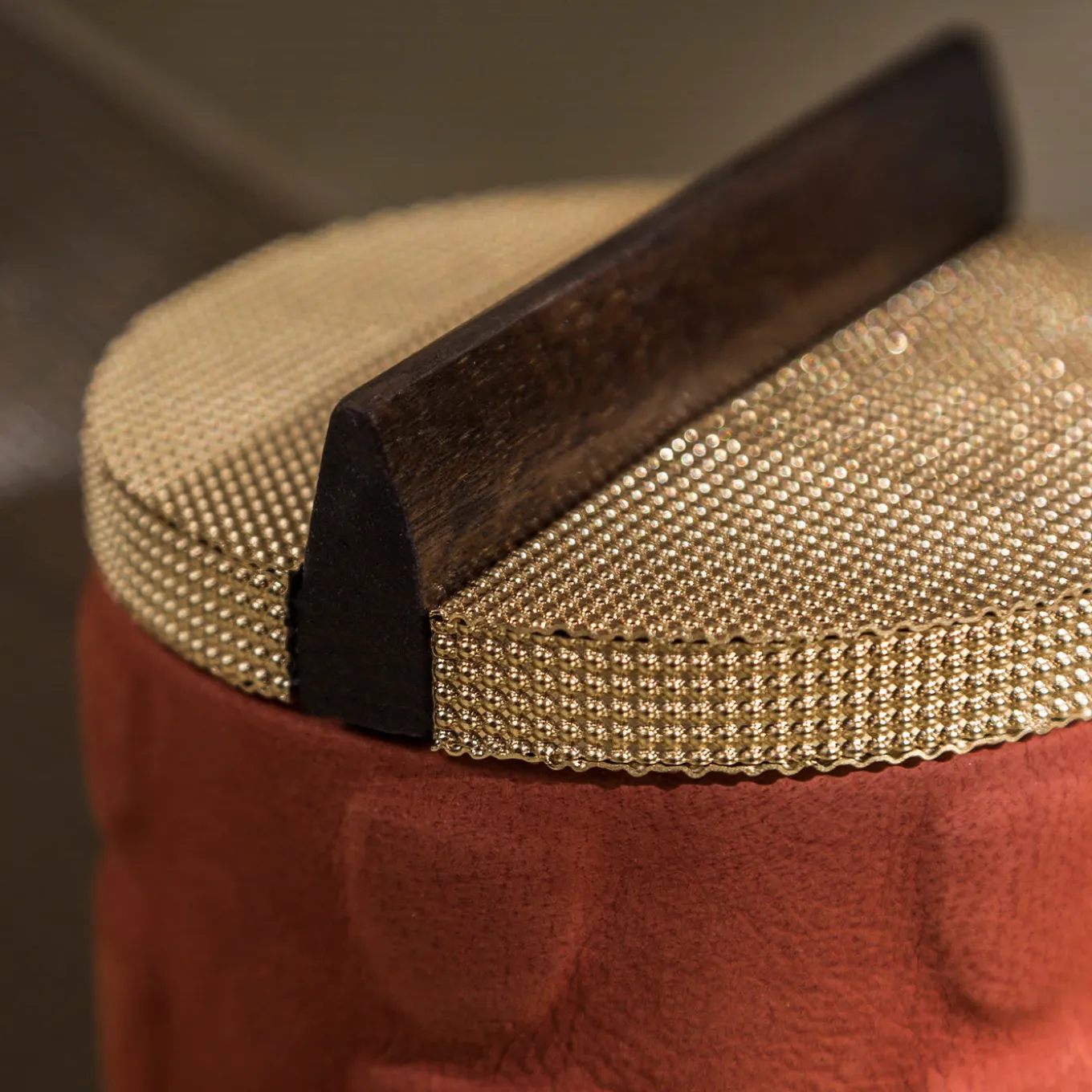 Questo esclusivo cofanetto artigianale della Collezione Bacabs è un’aggiunta impeccabile a una collezione personale di contenitori di lusso per gioielli. Il suo corpo cilindrico in massello di noce canaletto è arricchito da sagome in rilievo prese in prestito dall’arte precolombiana e impreziosito dal prezioso rivestimento in pelle Nubuck color corallo per un tocco seducente. Una lineare maniglia in legno – che celebra le linee razionaliste – divide in due metà semicircolari il coperchio in ottone a maglie luminose.