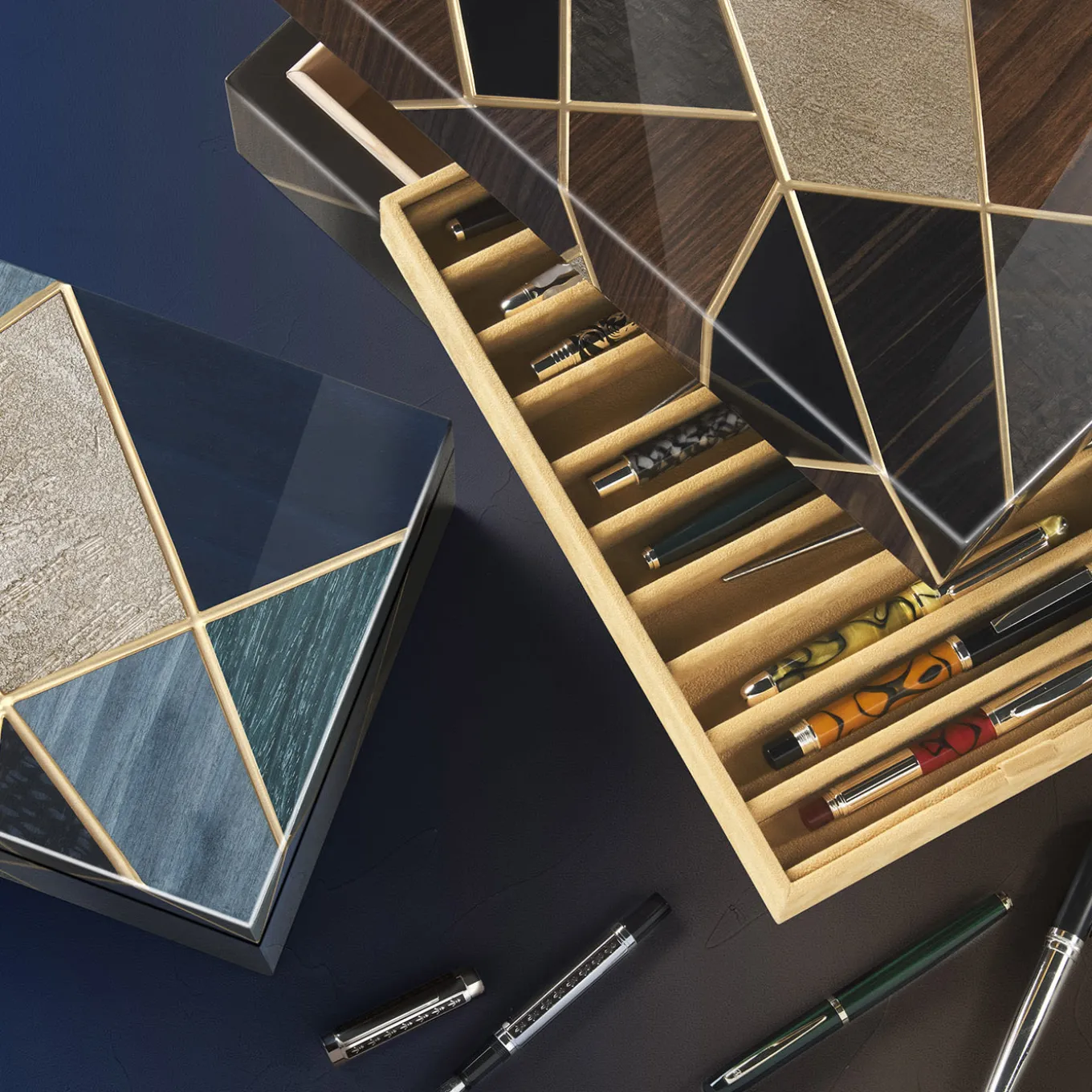 Vero e proprio gioiello per i collezionisti, questo lussuoso portapenne è all’insegna dell’esclusività. La radica, l’ebano, il palissandro, il frassino e il bolivar sono disposti in un intarsio geometrico fatto a mano e sigillato da contorni in oro, versato a mano quando è ancora caldo. Foderato con pregiata Alcantara beige, l’interno è organizzato in due ripiani che ospitano dieci penne ciascuno. Lucidato e spazzolato per ottenere una finitura a specchio.