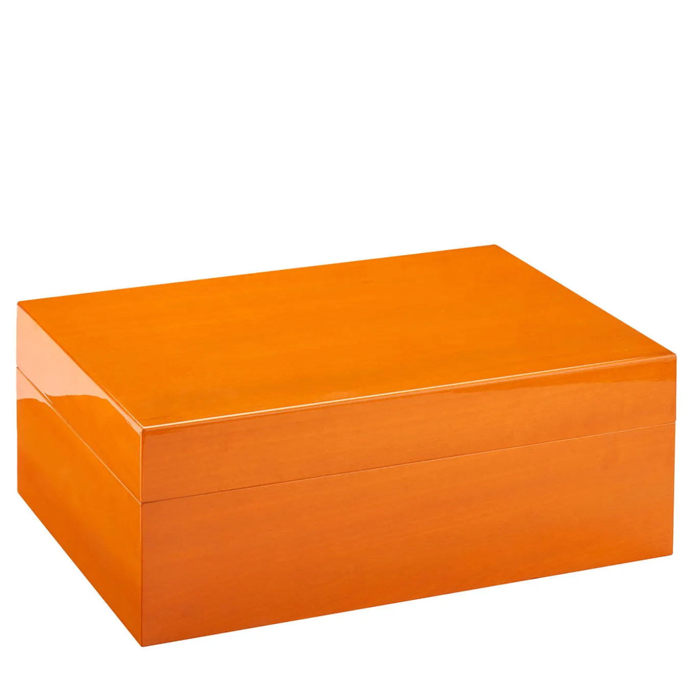 Fondendo l’artigianato tradizionale con il design contemporaneo, questo portasigari in legno di cedro appartiene alla serie Roma di design esclusivi realizzati a mano. Arricchito da dettagli in metallo zincato dorato, è dipinto in una tonalità arancione che ne esalta le venature naturali, lucidato e spazzolato a mano con poliestere per una luminosa finitura a specchio. Può contenere fino a 40-50 sigari ed è composto da un igrometro e da un porta umidificatore. Disponibile in altri colori e dimensioni, consultare il catalogo Artemest per le opzioni.