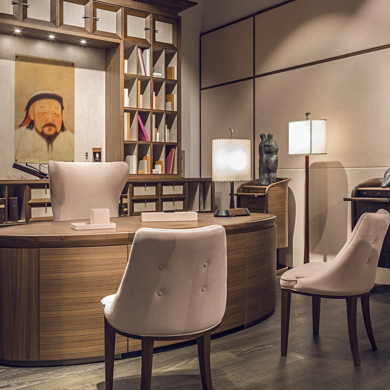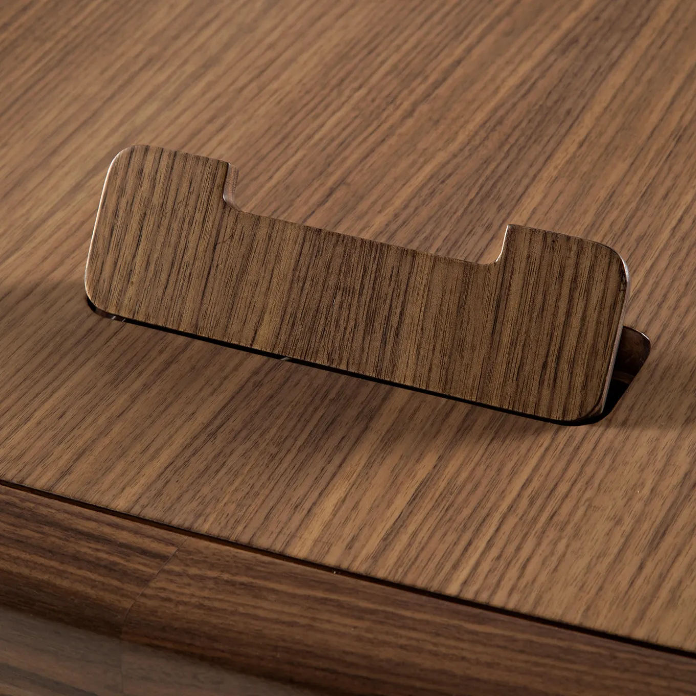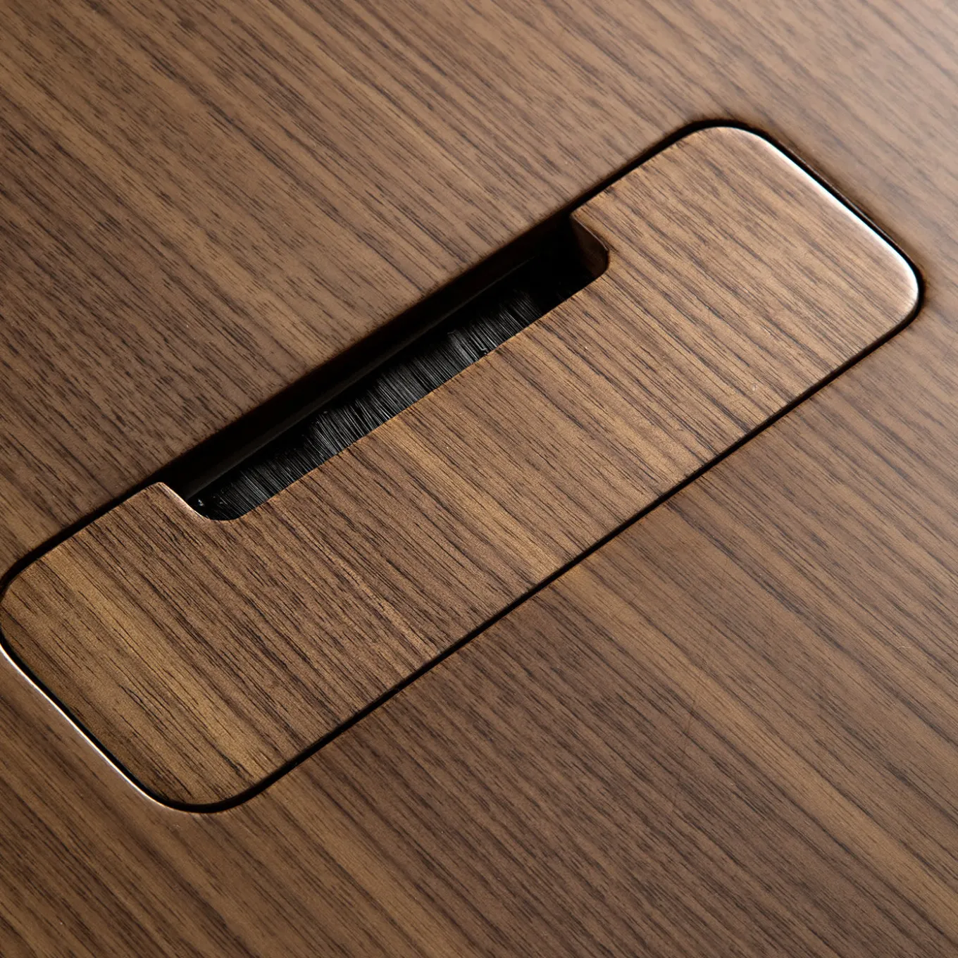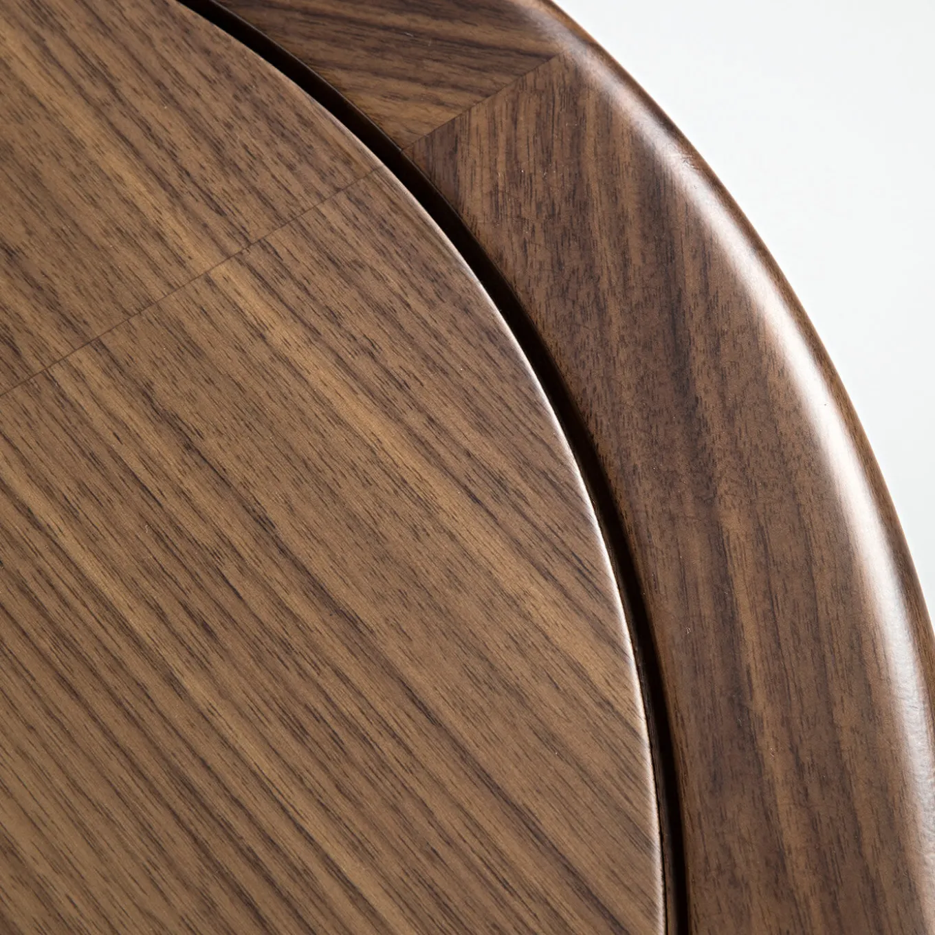 L’allure senza tempo e la squisita fattura fanno di questa scrivania un complemento prezioso per un arredamento moderno o classico. La struttura ovale è in legno di noce, mentre la capacità di archiviazione è equamente distribuita su ciascun lato in tre cassetti di dimensioni diverse.