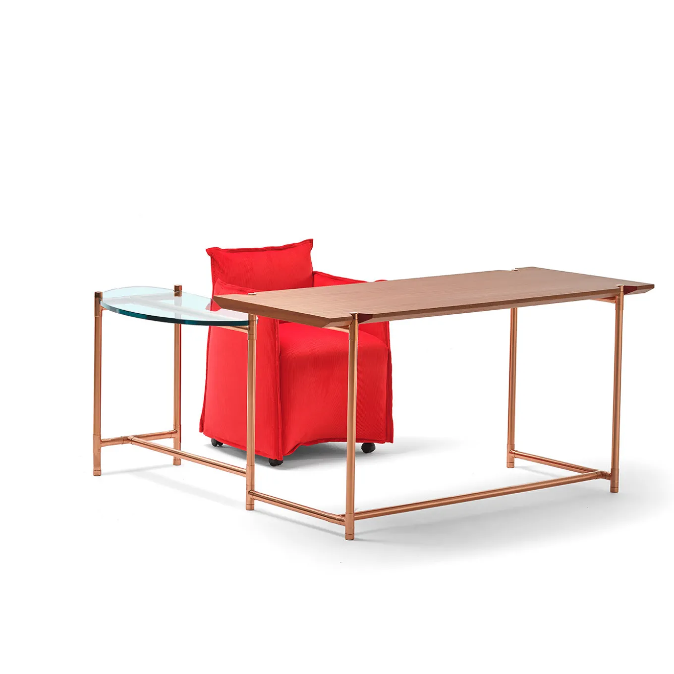 Questa elegante scrivania, che combina materiali leggeri e pregiati, è in grado di valorizzare qualsiasi ufficio o studio moderno con una raffinatezza discreta. La struttura interna in acciaio con tubi di rame esterni sostiene un piano rettangolare in pannelli di fibra a media densità rivestiti in rovere, mantenuto in posizione con l’aiuto di quattro intagli rifiniti in rosso. Lo stesso sistema funge da supporto per l’ulteriore superficie girevole in vetro float di 1,5 cm di spessore, dalla silhouette ellissoidale.