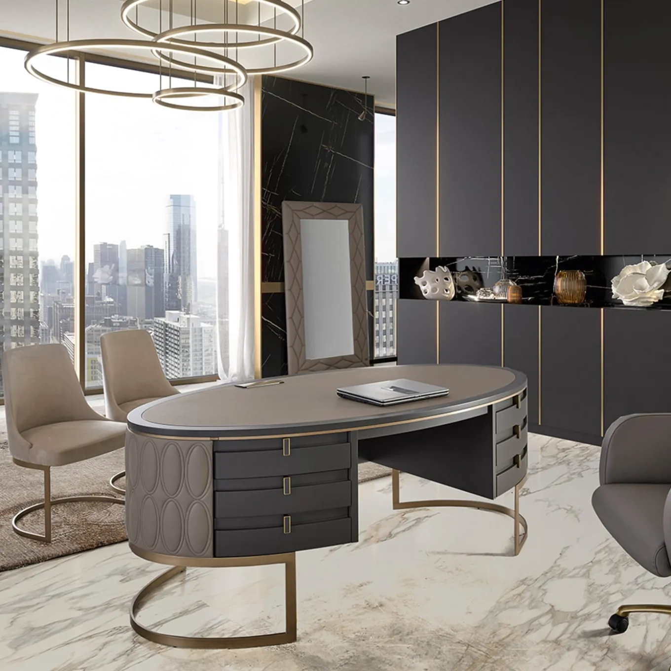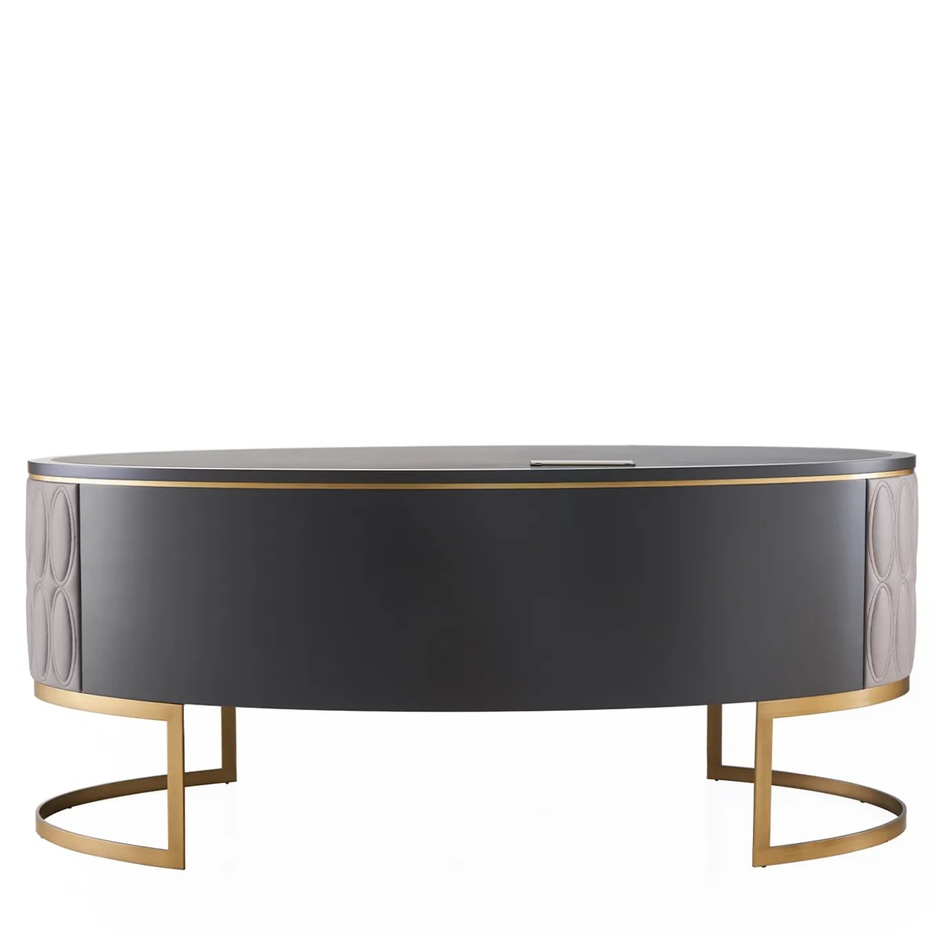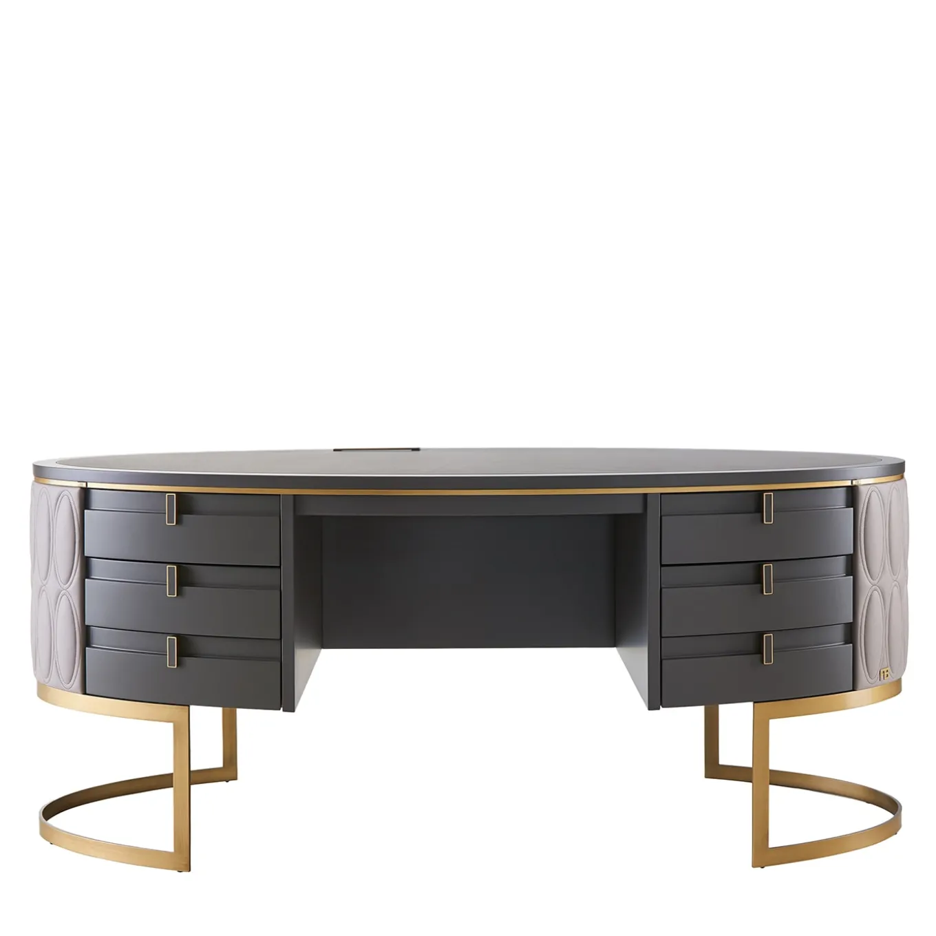 Creazione unica nel suo genere, questa scrivania incarna un’eleganza funzionale con il suo design moderno e i suoi materiali di lusso. La struttura curva in legno laccato ardesia opaco poggia su una base in metallo bronzato, mentre il piano è in legno e pelle “Chalky” trapuntata. Sei cassetti con chiusura ammortizzata e interni in legno chiaro offrono stile e praticità. Gli accenti in pelle trapuntata lo rendono il punto focale di qualsiasi ufficio direzionale o studio presidenziale. Disponibile una presa di corrente opzionale personalizzabile.