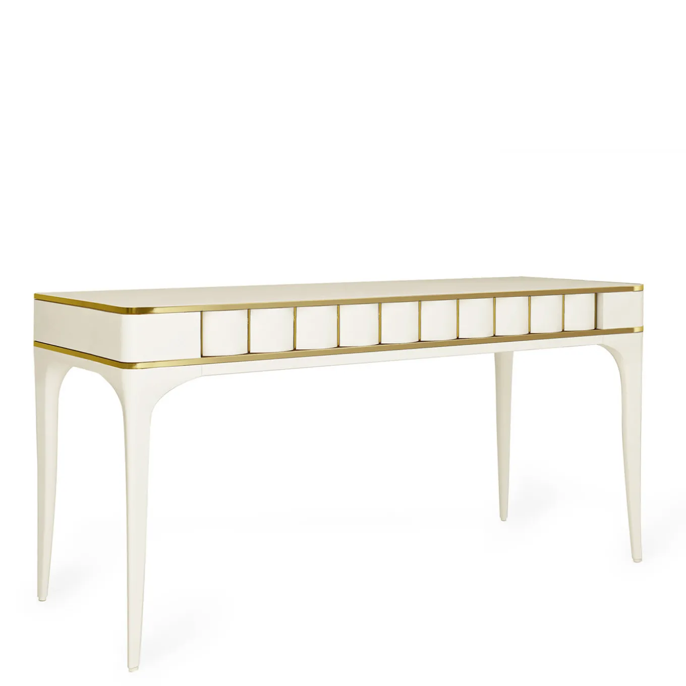 Disegnata da Isabella Costantini e splendidamente realizzata da artigiani italiani, la scrivania Duilio presenta un cassetto a coste e gambe eleganti. I dettagli in metallo e lo splendido design conferiranno eleganza e raffinatezza a qualsiasi spazio della vostra casa. Accessori e dettagli: 1 cassetto rivestito in pelle ecologica. Finitura: laccato opaco avorio e dettagli in metallo con finitura in ottone.