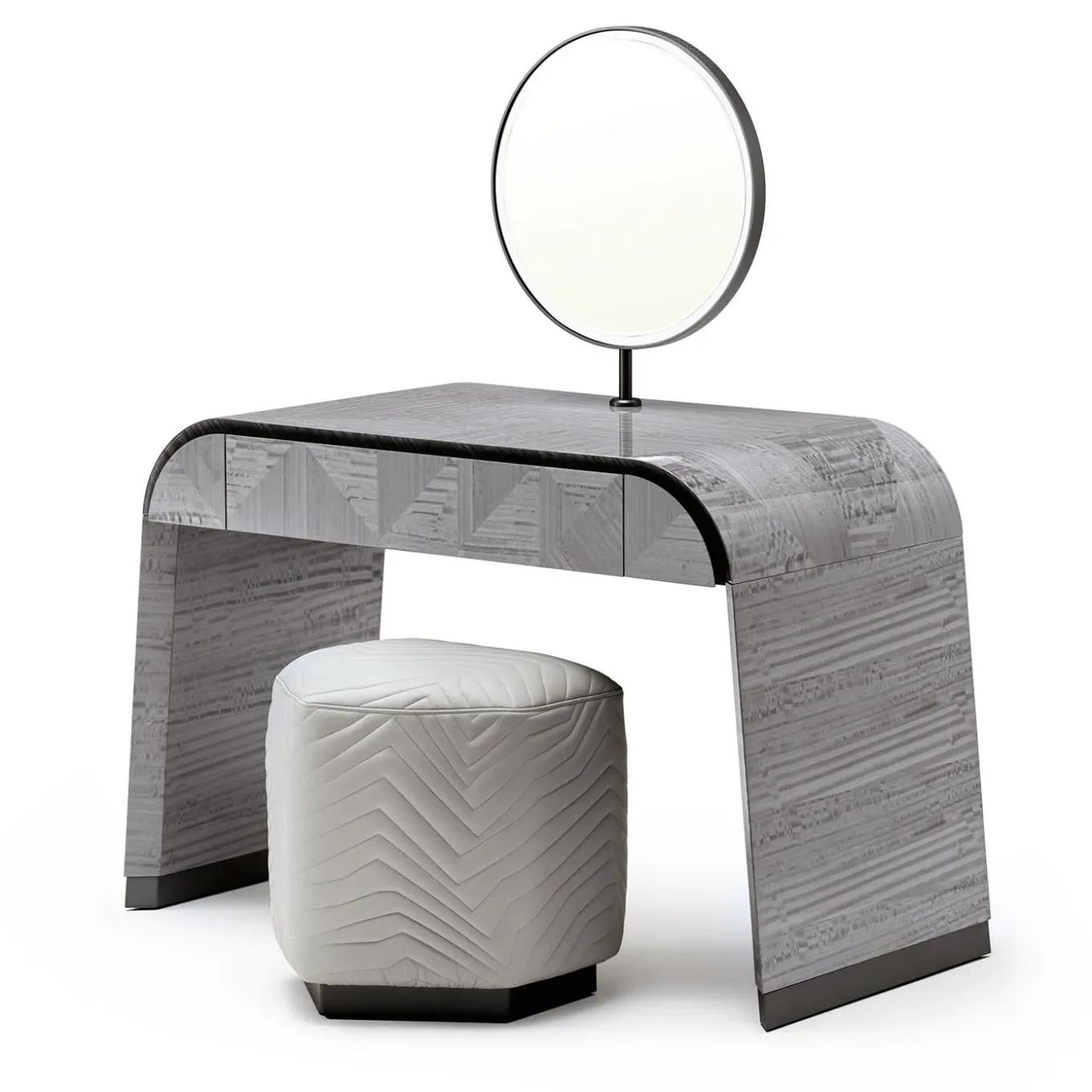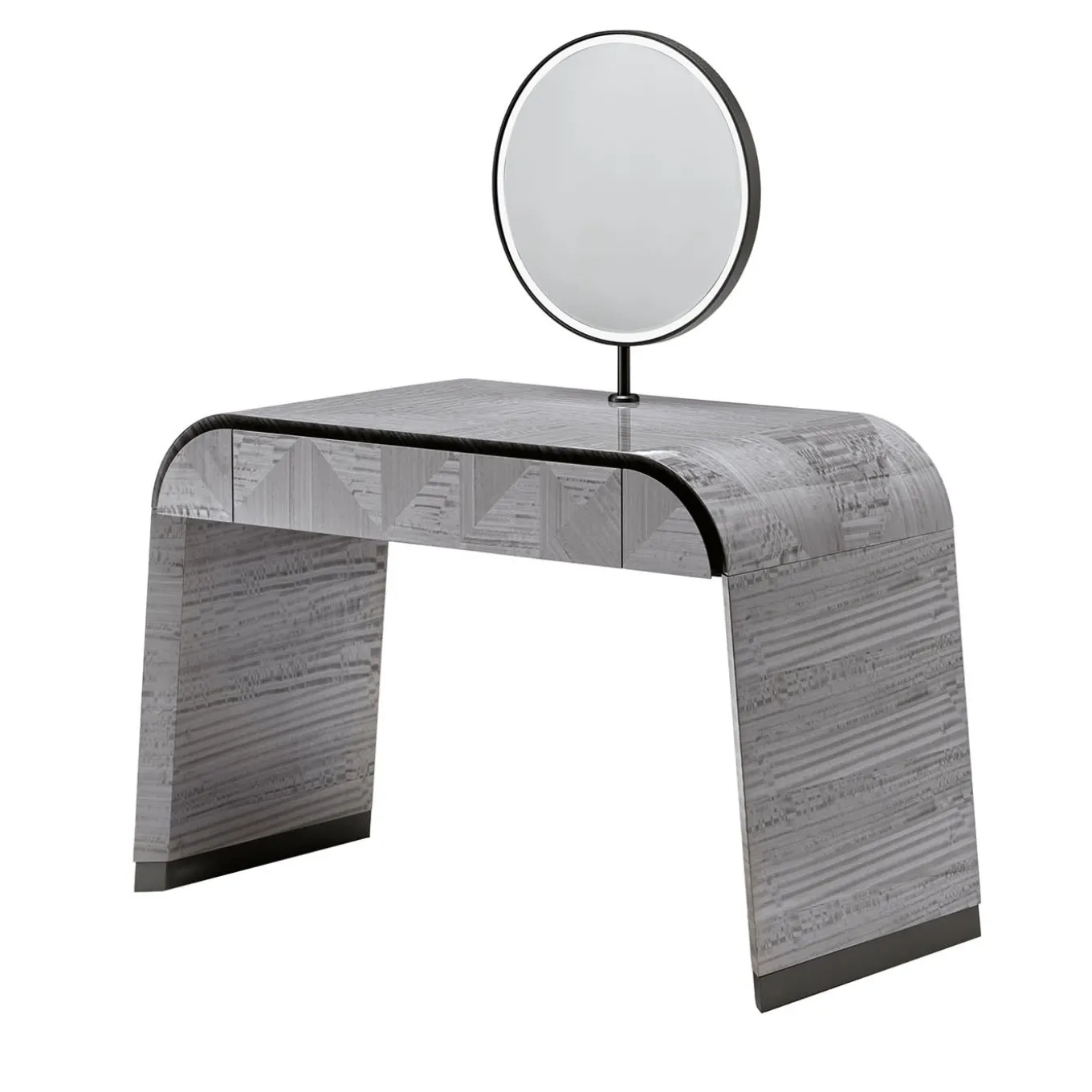 Scrittoio curvo in impiallacciato di Eucalipto riccio della Tasmania con finitura in poliestere lucido. Gambe curve con dettagli in acciaio inox satinato grigio nichel. Un cassetto esterno ad estrazione totale con parte inferiore in tessuto vellutato.