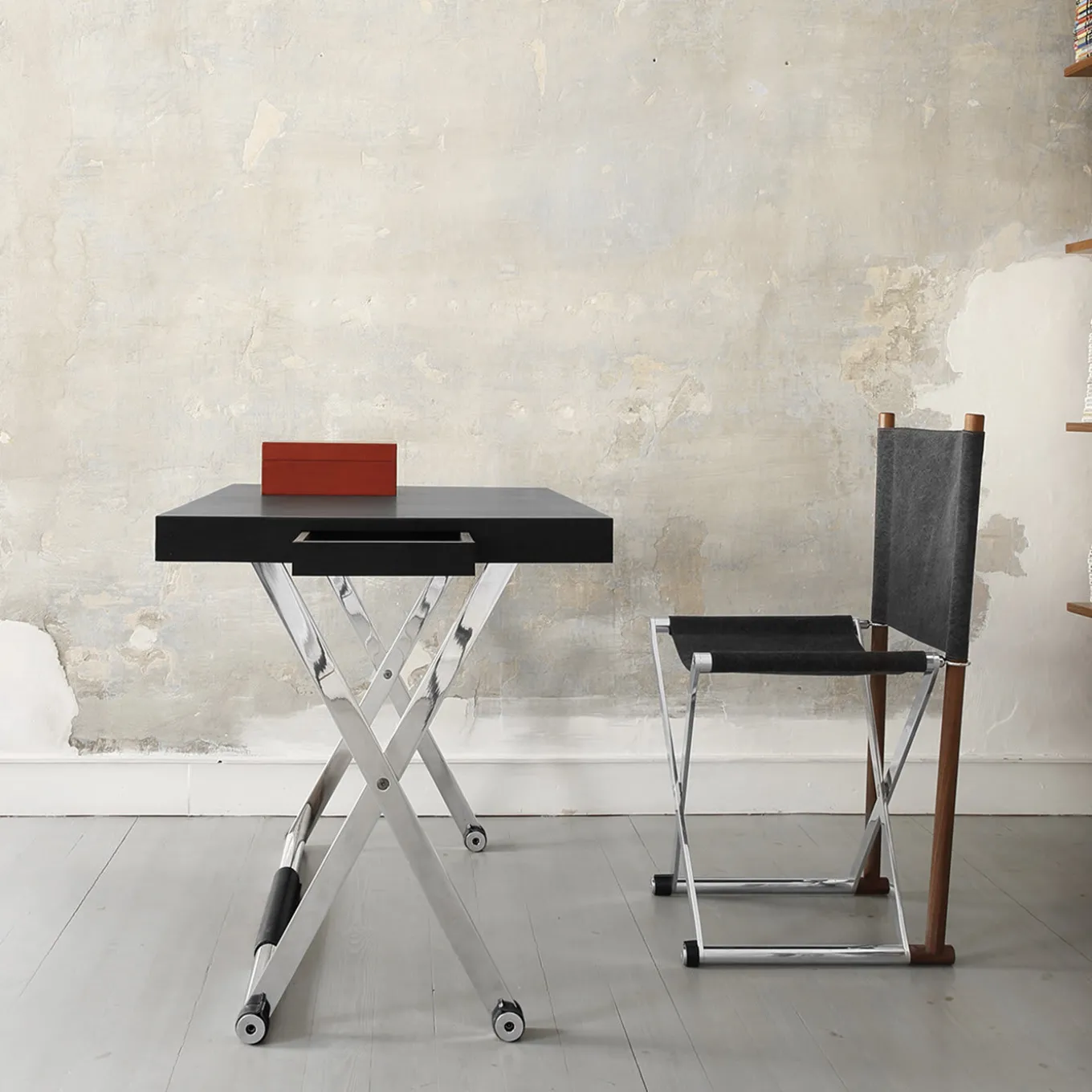 Progettata pensando agli interni moderni, questa scrivania di lusso è pieghevole e può essere un’aggiunta preziosa e versatile a qualsiasi stanza. Il piano in legno massiccio è rivestito in pelle nera smerigliata, mentre le quattro gambe incrociate sono in alluminio, con un inserto in pelle sull’elemento inferiore. Altri colori sono disponibili su richiesta e il rivestimento può essere anche in pelle pieno fiore.
