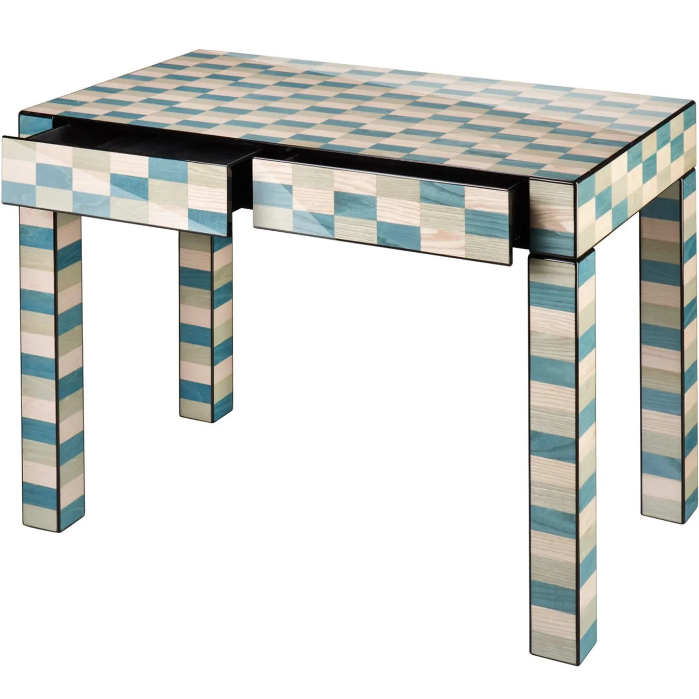 Questo scrittoio, che mostra le venature naturali attraverso le finiture lucide e spazzolate a specchio della forma rettangolare in legno, vanta un intarsio dipinto a mano in una delicata tavolozza ispirata ai colori della laguna di Venezia. Presenta due cassetti rivestiti in Alcantara nera. Disponibile in altri colori, consultare il catalogo Artemest per le opzioni.