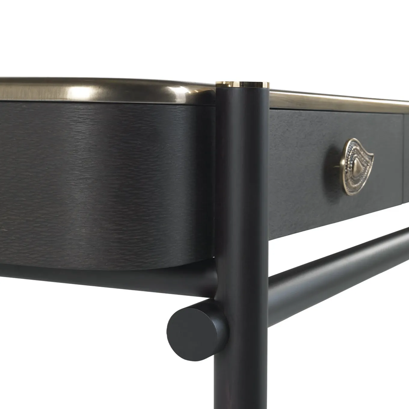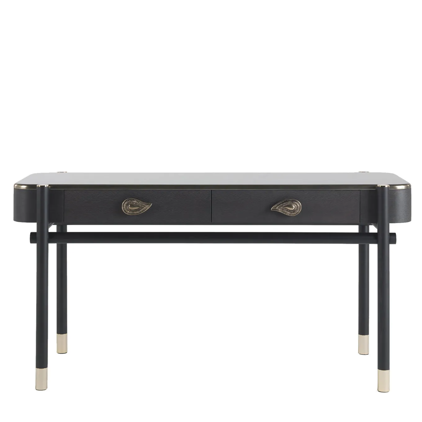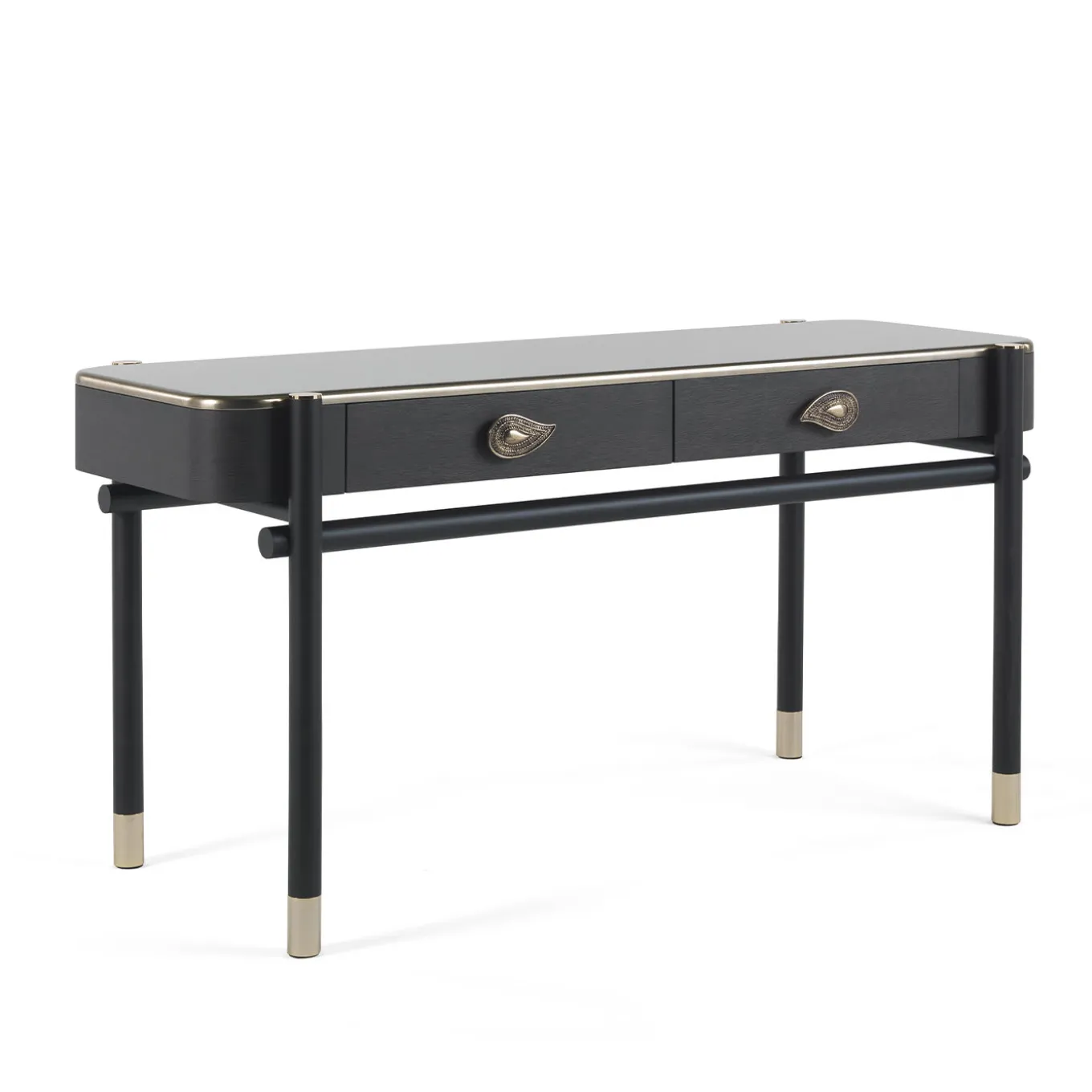 Una calda combinazione di essenze e finiture per la toeletta Woodstock, un mobile che completa la collezione Woodstock lanciata nel 2018. La struttura è in legno tinto wengè scuro opaco, il piano è in legno laccato oro liquido patinato mentre i fianchi con cassetti sono in legno Carbalho tinto wengè scuro opaco, materiale che richiama il mood afro della collezione 2019. Il paisley decorativo in ottone lucido richiama l’essenza più profonda del marchio Etro Home Interiors. “Dressing table” Struttura in legno tinto wengè scuro opaco. Piano in legno laccato oro liquido patinato e fianchi con cassetti in legno Carbalho tinto wengè scuro opaco. Puntali ed elementi decorativi in ottone lucido. Parti interne dei cassetti rivestite in microfibra.