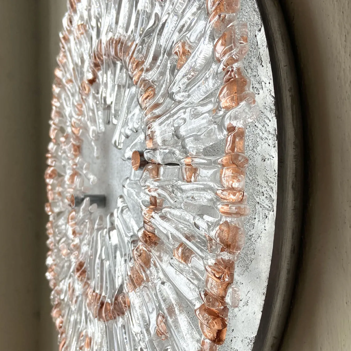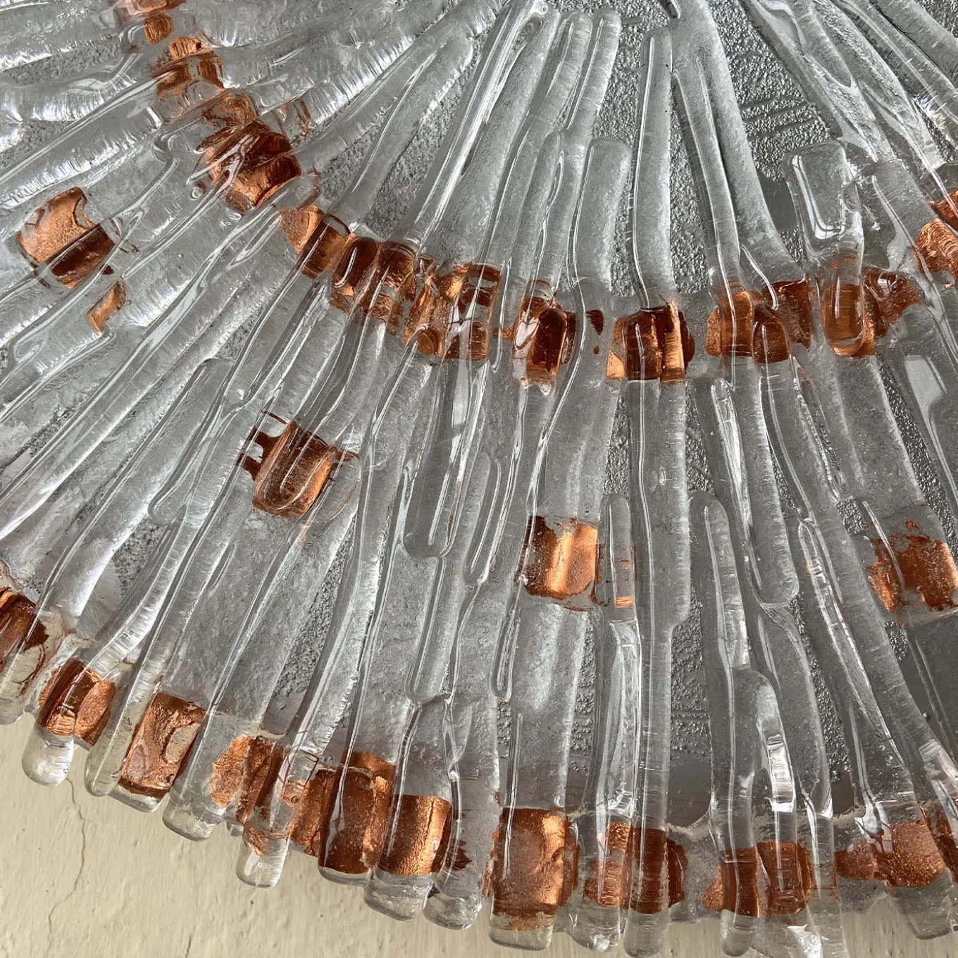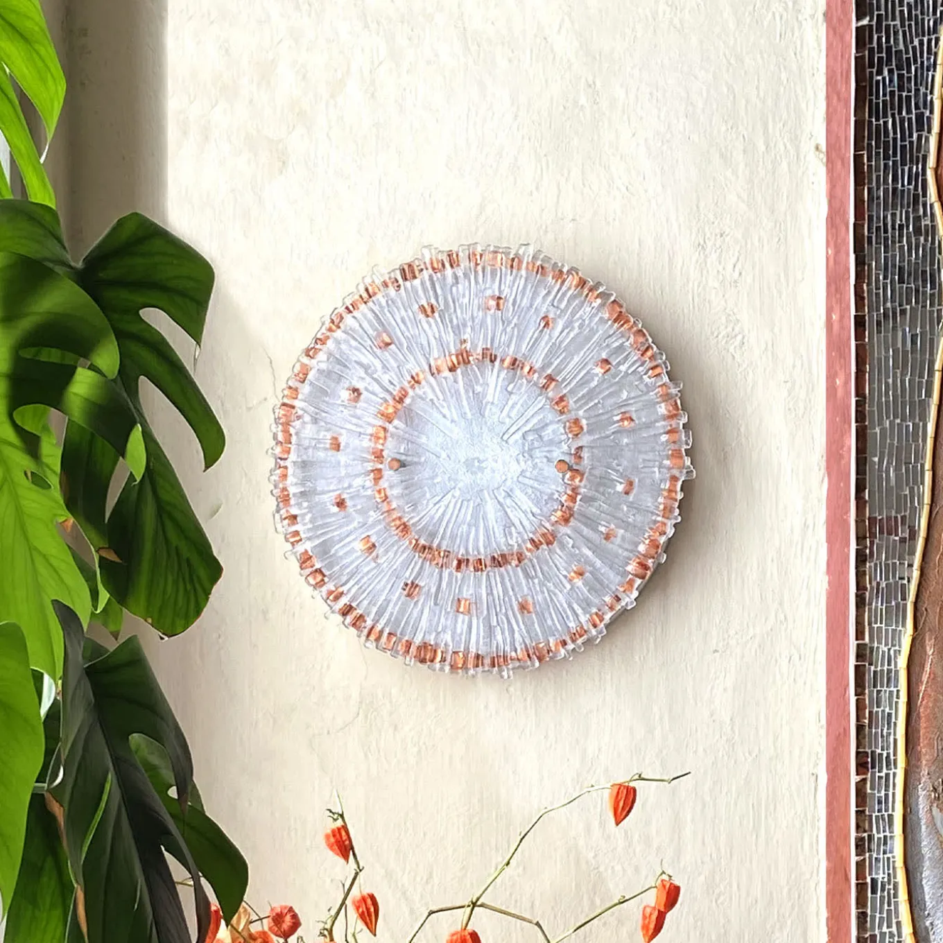 La scultura Raggio Rame è un’opera d’arte circolare unica nel suo genere, composta da elementi in vetro trasparente disposti a raggiera e impreziositi da dettagli in mica di rame con un motivo a spirale. Il suo design tridimensionale riflette magnificamente la luce, esaltando i colori circostanti. Montata su una base in legno con finitura argentata, unisce eleganza moderna e raffinatezza artistica. A causa della lavorazione a mano, possono verificarsi lievi variazioni.