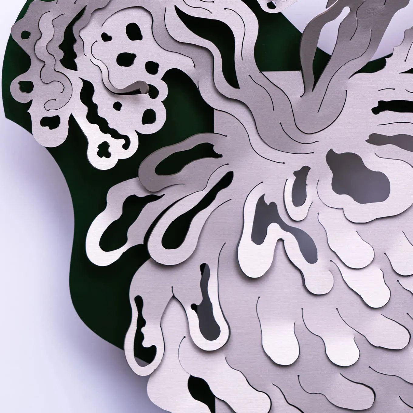Omaggio a Psiche, la bellezza eterea e curiosa del mondo mitologico, questa stupenda carta da parati appartiene a una serie esclusiva disegnata da Matteo Cibic. Realizzata a mano in metallo, presenta finiture argentate e verdi, impreziosite da un sofisticato gioco di ombre. Per ulteriori informazioni, consultare il Concierge.
