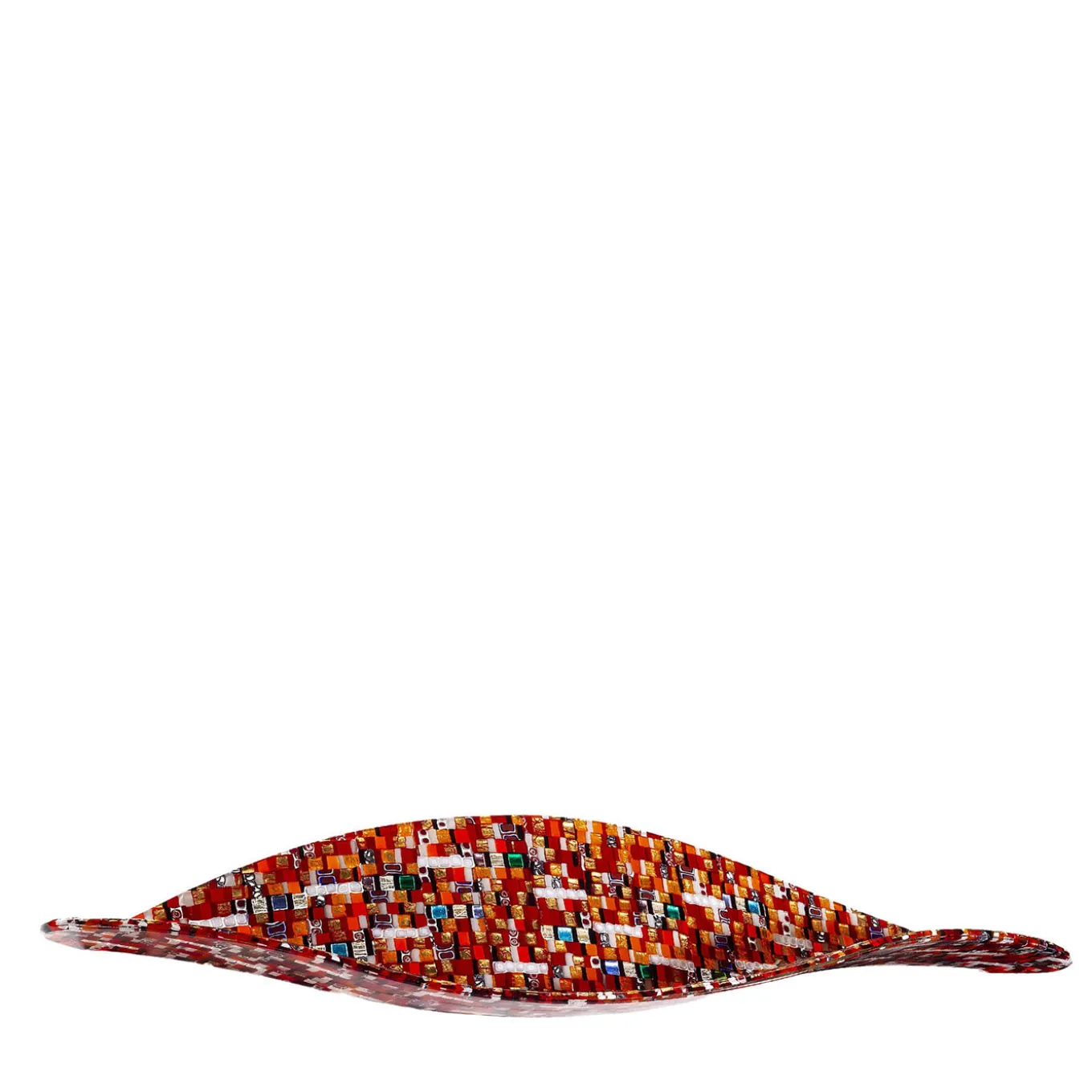 Questa splendida scultura decorativa in vetro di Murano soffiato a mano è realizzata con centinaia di piccole tessere di mosaico multicolore. La sua forma sinuosa la rende un elemento d’arredo versatile, adatto a qualsiasi ambiente, sia come centrotavola che come accento elegante. Il rosso veneziano, il verde chiaro, l’acquamarina, il nero, l’avorio e gli elementi in foglia d’oro e d’argento si fondono in un armonioso equilibrio di forme e colori. Ogni pezzo è realizzato meticolosamente da maestri vetrai veneziani.