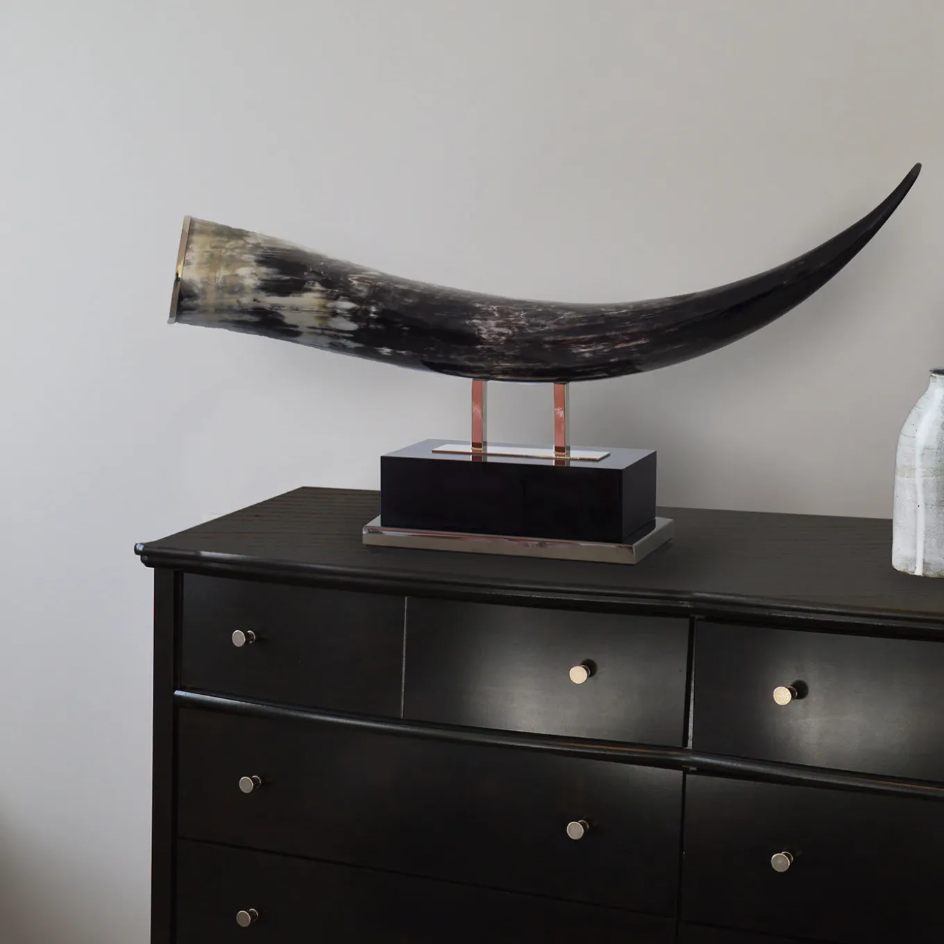 Montata su una base rettangolare in resina nera ornata da dettagli in ottone nichelato, questa scultura farà bella mostra di sé in sala da pranzo o in soggiorno. Realizzata in vero corno lucidato e trattato con cera naturale per preservare e proteggere la sua lucentezza, la forma curva mostra uno splendido colore nero con sfumature bianche. Piccole differenze e imperfezioni rispetto all’articolo illustrato sono da aspettarsi e sono considerate segni di qualità unica. Fa parte della collezione Fidia.