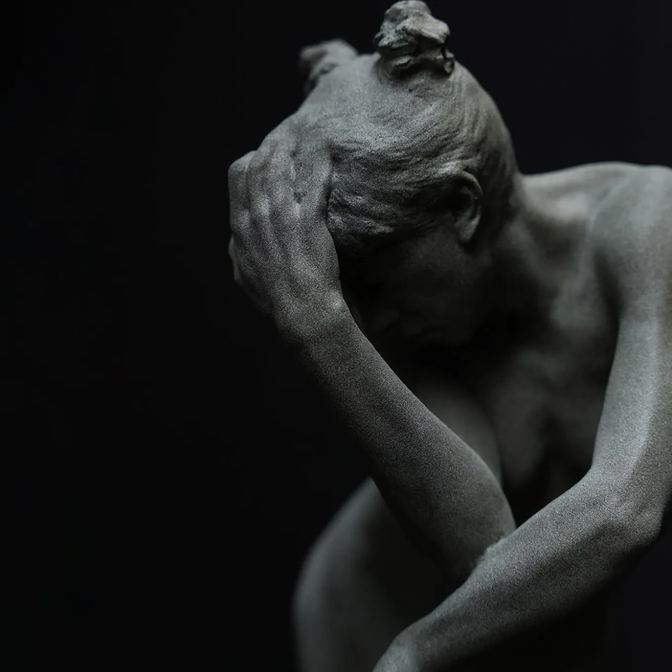 Ewe è una scultura in resina grigio scuro che incarna la fragilità dell’umanità in un momento di profonda introspezione. Scolpita con notevole precisione, questa figura femminile rivela una postura di vulnerabilità e contemplazione, con le braccia incrociate e la testa inclinata in silenziosa riflessione. Ogni curva e piega della pelle danza tra luce e ombra. Questo pezzo non è solo decorativo: è un viaggio nell’anima. Ogni pezzo è unico e, a causa della lavorazione a mano, possono verificarsi lievi variazioni.