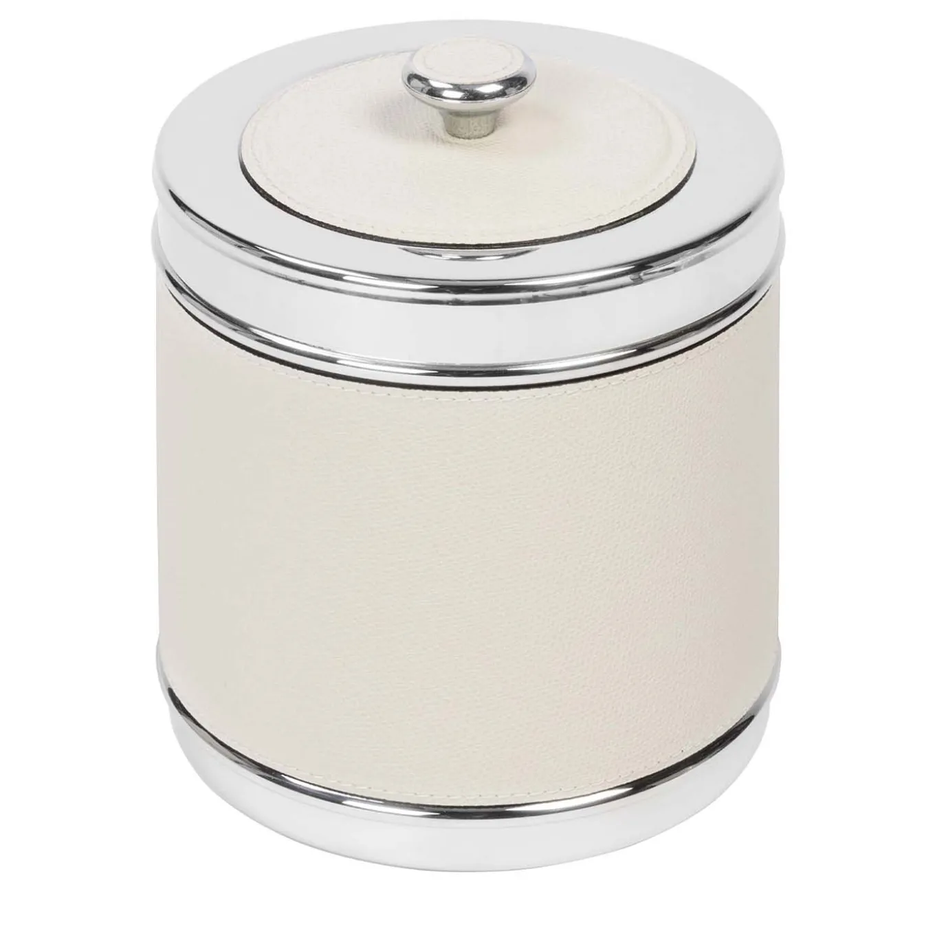 Secchiello per ghiaccio in acciaio a doppia camera, parzialmente rivestito in pelle, con finitura cromata. Fornito di coperchio.