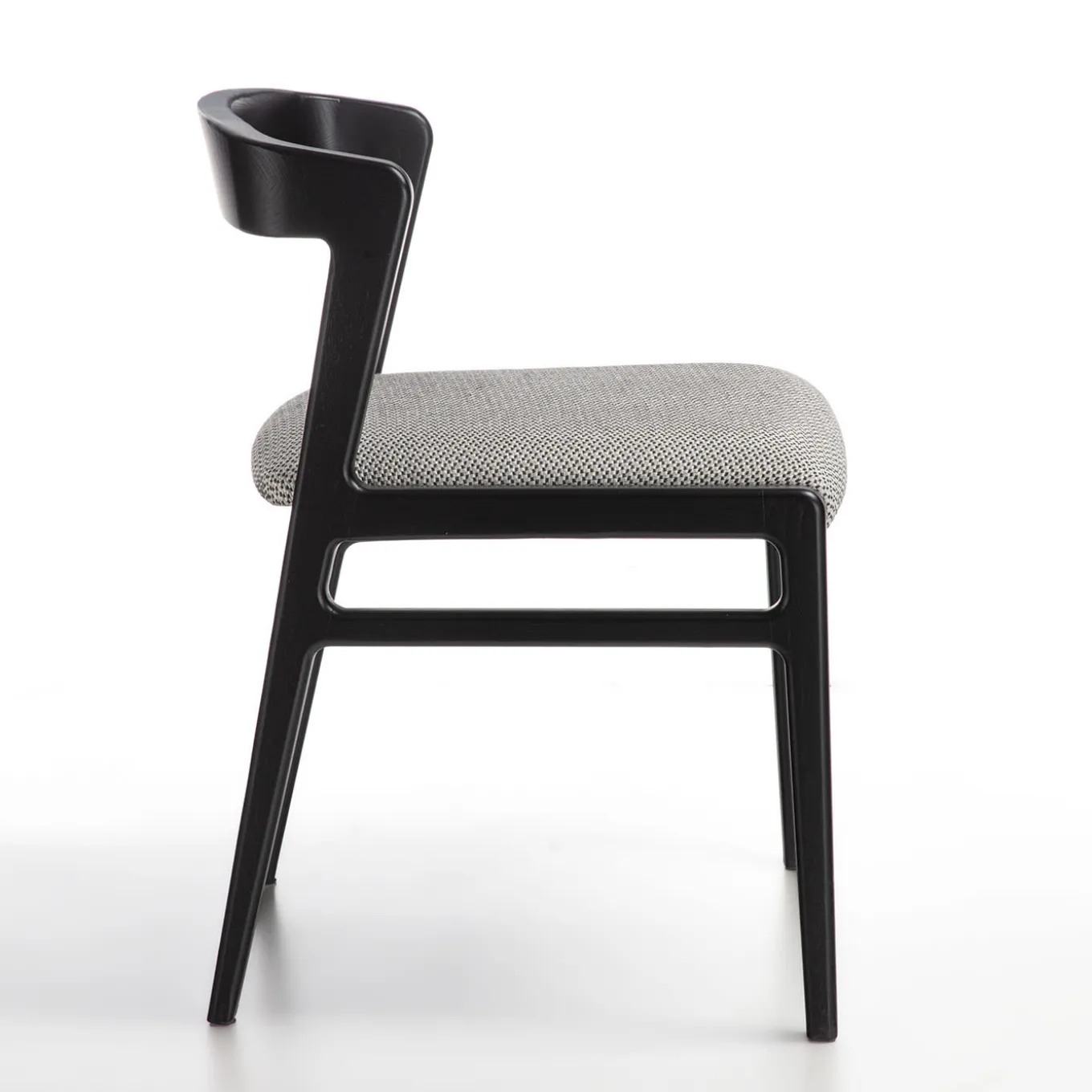 Sedia della linea Aida dal design essenziale e leggero. Struttura in legno massiccio e seduta rivestita in tessuto.