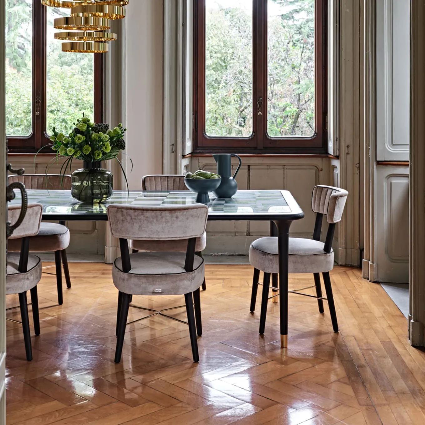 Esclusivi dettagli sartoriali e una generosa imbottitura conferiscono a questa sedia in faggio tinto moka un fascino sofisticato. Perfetta per gustare i pasti senza rinunciare al comfort, l’imbottitura interna in poliuretano espanso è rivestita in morbido tessuto bianco (non rimovibile), impreziosita da un disegno a canali lungo la parte anteriore dello schienale e arricchita da dettagli in piping a contrasto. Il poggiapiedi a forma di X, rifinito in oro lucido, completa il design.